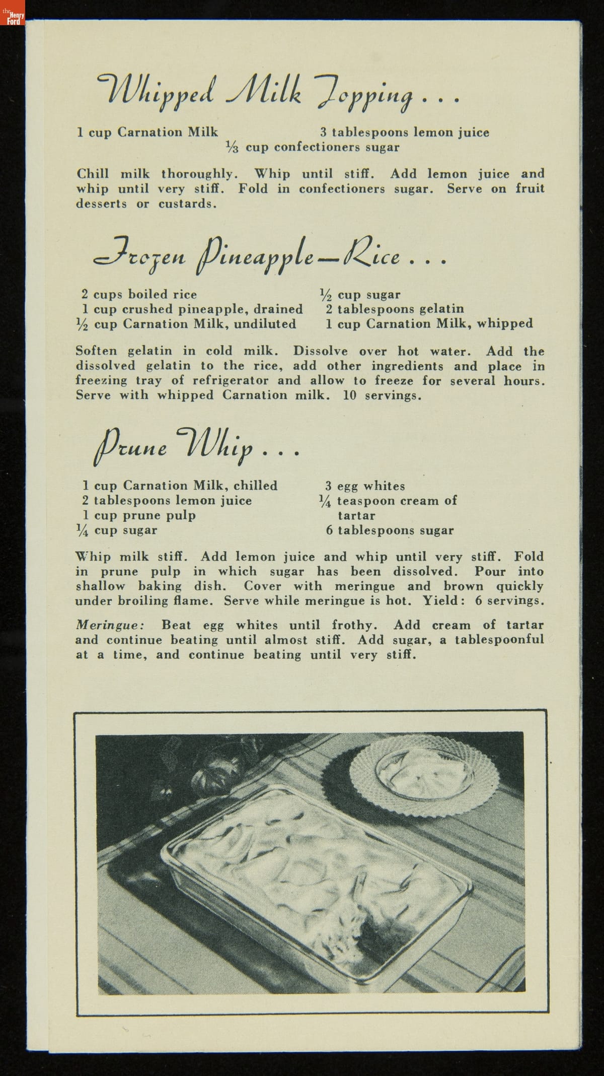 In 1899, Elbridge Amos Stuart developed his evaporated milk product -- his alternative to fresh milk, which was quick to sour. He prided himself on producing the highest quality of milk, under the name Carnation Evaporated Milk Company. Although similar to condensed milk, evaporated milk does not contain sugar, allowing for a broader range of uses. This booklet provides uses for Carnation milk in desserts.
