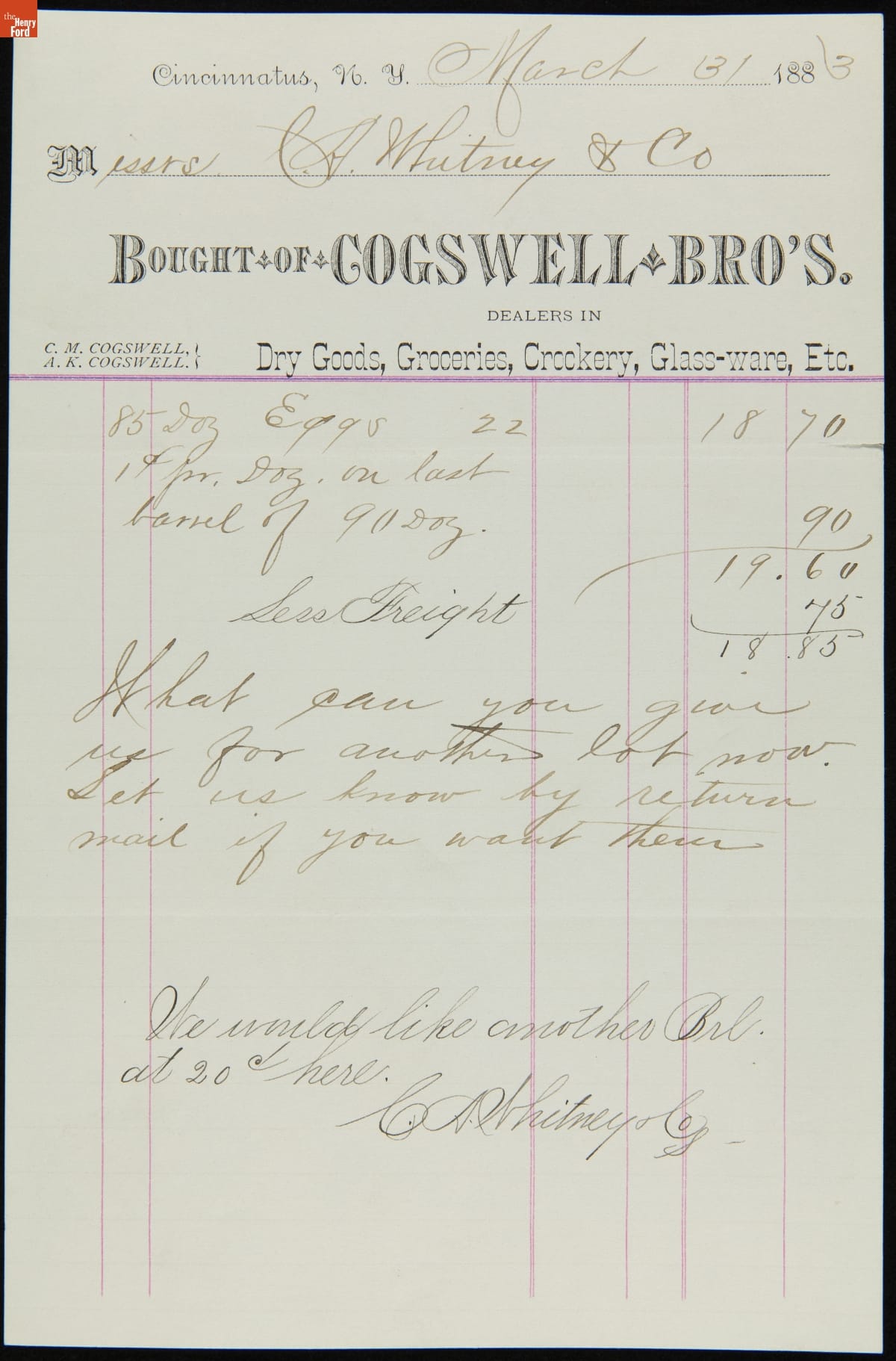 on front: [printed:] BOUGHT OF COGSWELL BRO'S. / DEALERS IN Dry Goods, Groceries, Crockery, Glass-ware, Etc. / [written:] 85 doz eggs...What can you give up for another lot now...[written in another hand:] We would like another Bul at 20c here. CH Whitney & Co. /