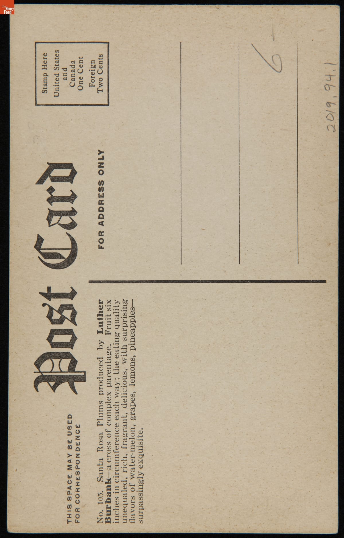 on front: No. 105. Luther Burbank's Santa Rosa Plums, awarded Gold Medal at Lewis and Clark World's Fair. In quality, surprisingly exquisite.