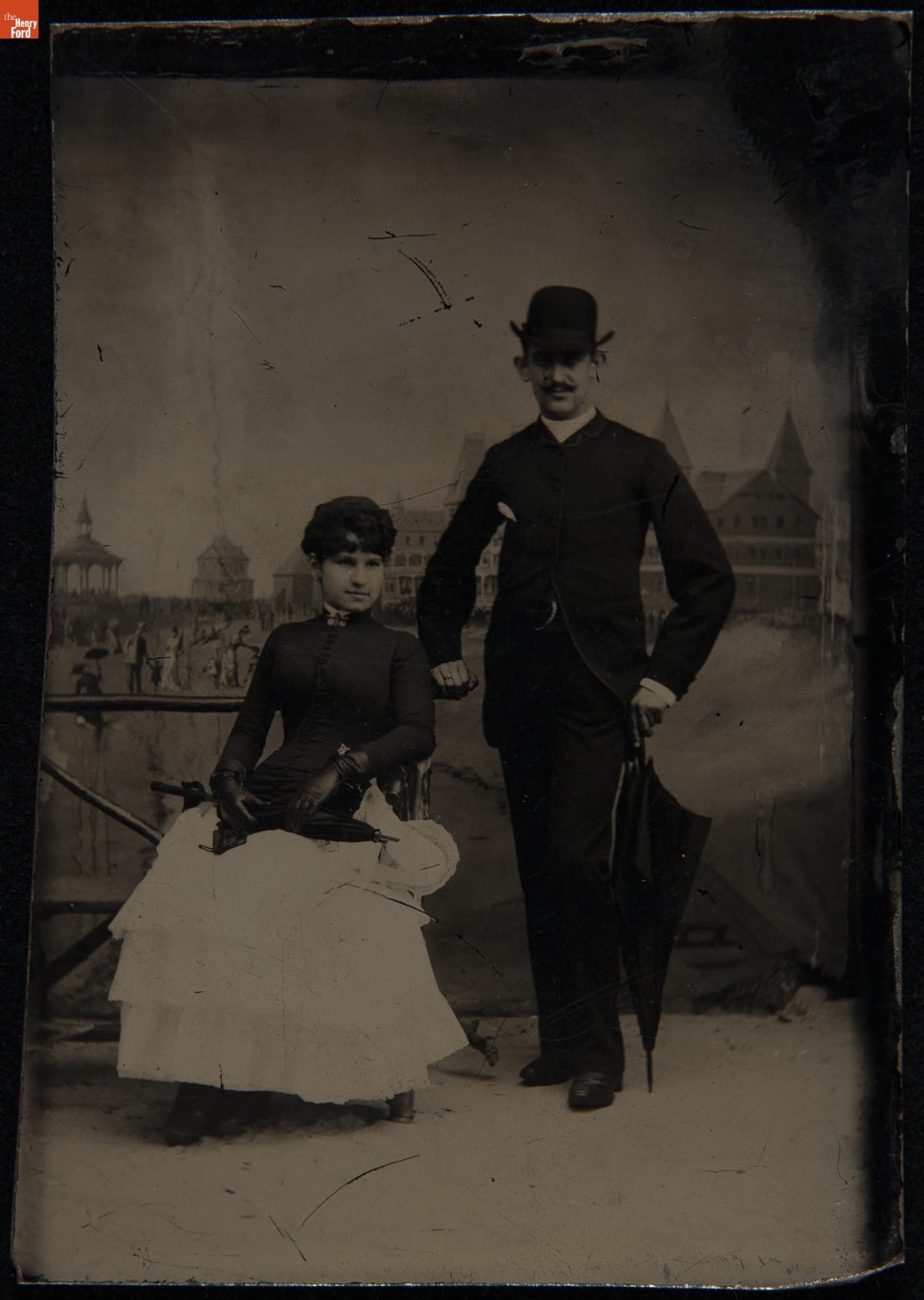 Man and Woman in Front of a Painted Backdrop of a Seaside Resort, circa 1890