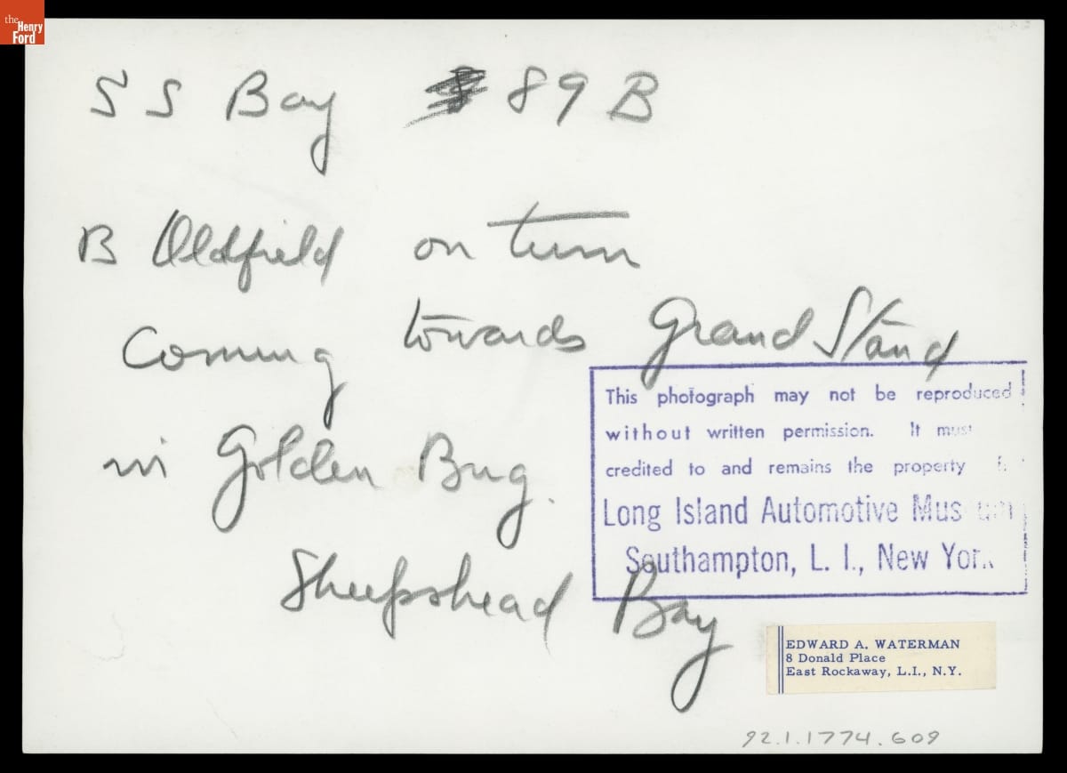 Barney Oldfield Driving "Golden Submarine" Race Car at Sheepshead Bay Board Track, Brooklyn, New York, 1917