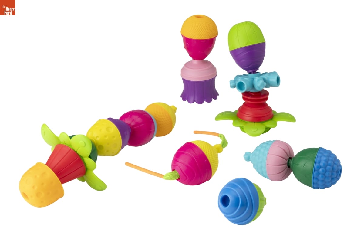 Designed by French company Lalabloom, these interconnecting beads are intended for long term use by children aged 10 months to 4 years. The beads can be clipped, stacked, screwed, or threaded together -- each method is suitable for a different age group. Toys like these help children practice both their gross and fine motor skills.