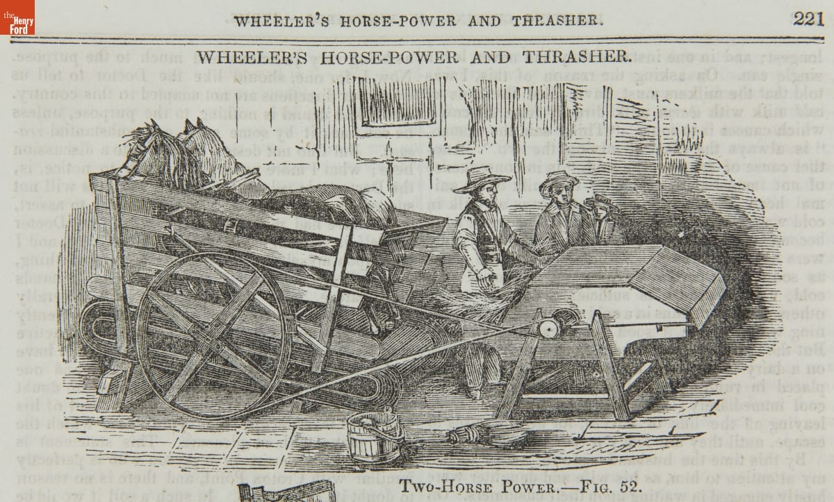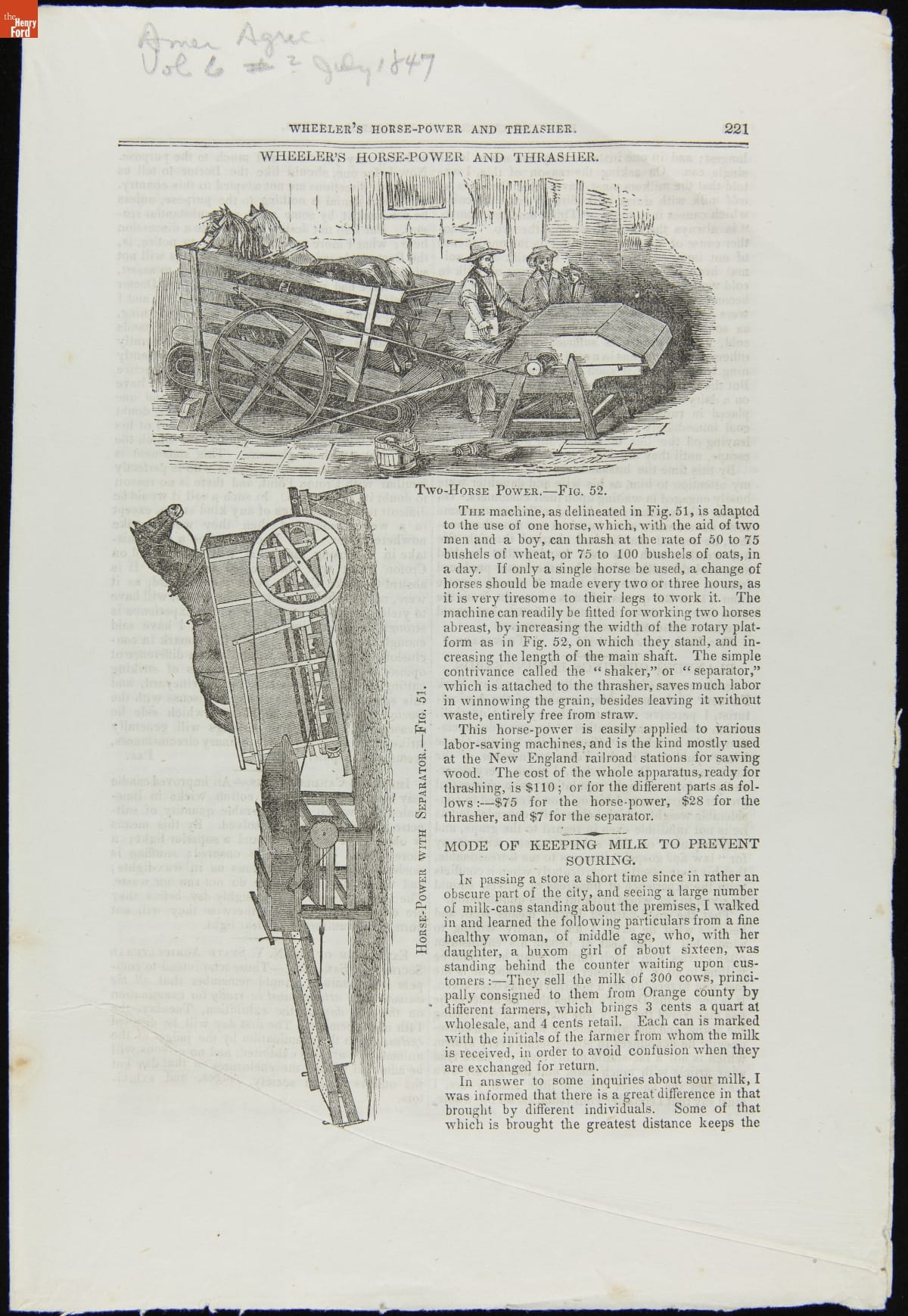 Farmers began to use stationary power sources in the nineteenth century as they mechanized barn or farmyard work like threshing, winnowing, or corn grinding. Some invested in animal treadmills like those advertised here. Animals walked on an "endless belt," a device similar to those on modern exercise treadmills. A wheel and belt converted the animals' movement to drive a variety of agricultural machinery.
