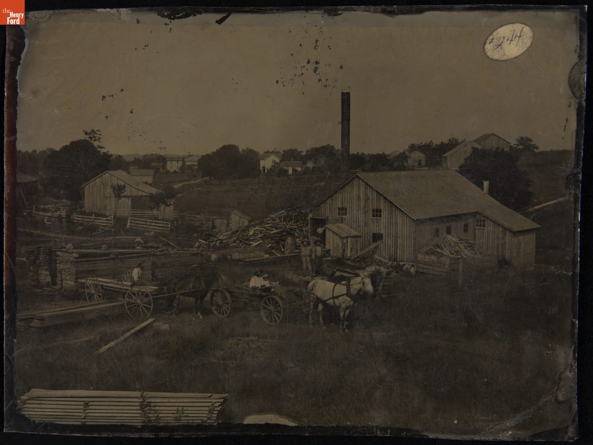 Workers and Horse-drawn Wagons at a Sawmill, 1880-1900