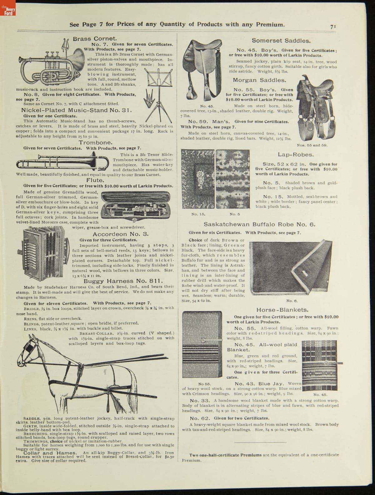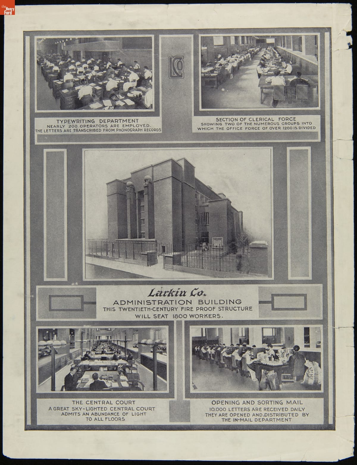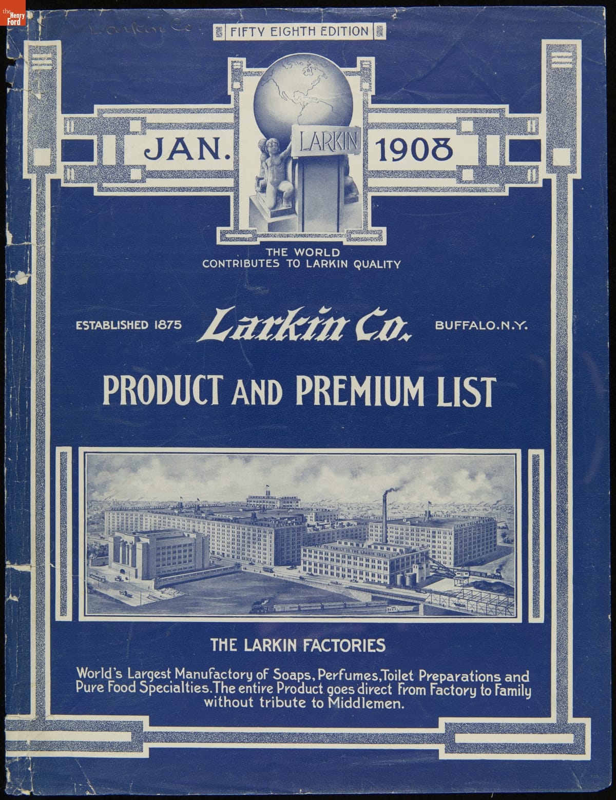 John D. Larkin established a soap manufacturing company in 1875. He hired his brother-in-law, Elbert Hubbard, as a salesman. Hubbard developed "The Larkin Idea," a plan that sold goods directly to consumers through mail-order catalogs and offered incentivizing giveaways. It was a success. By the early 1900s, Larkin's catalogs contained pages of products and even more pages of premiums from which customers could choose.