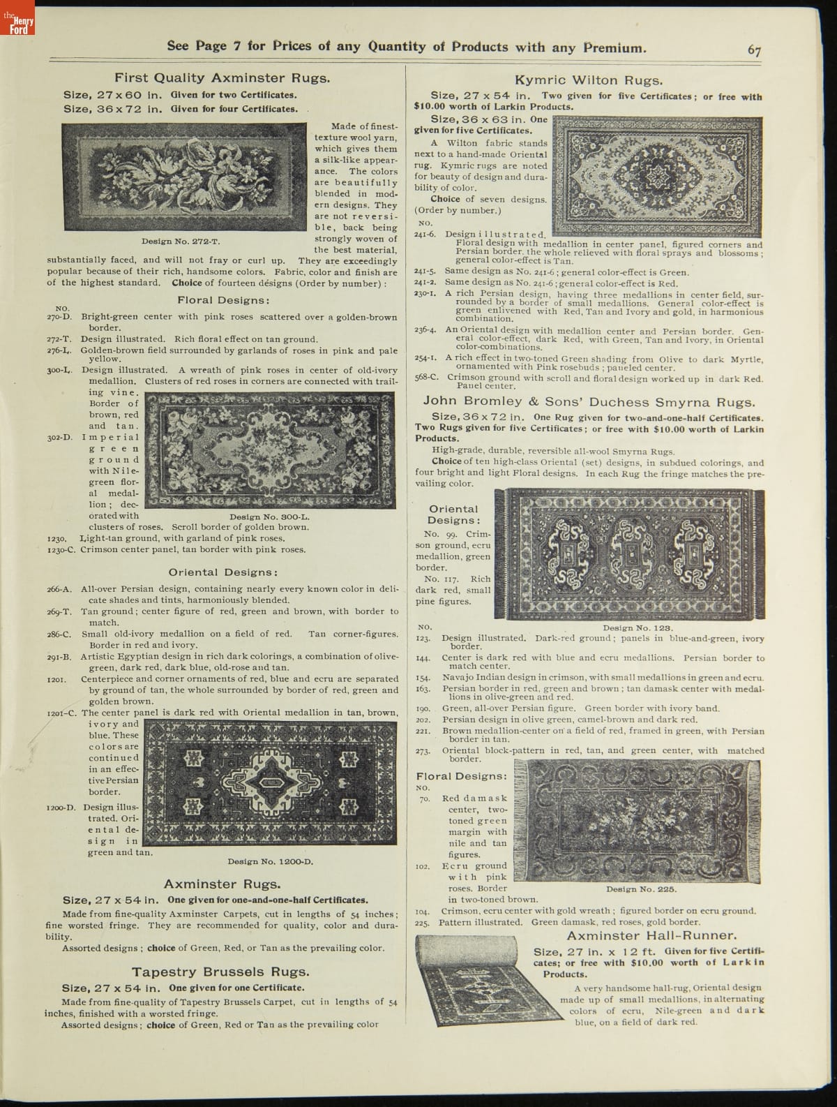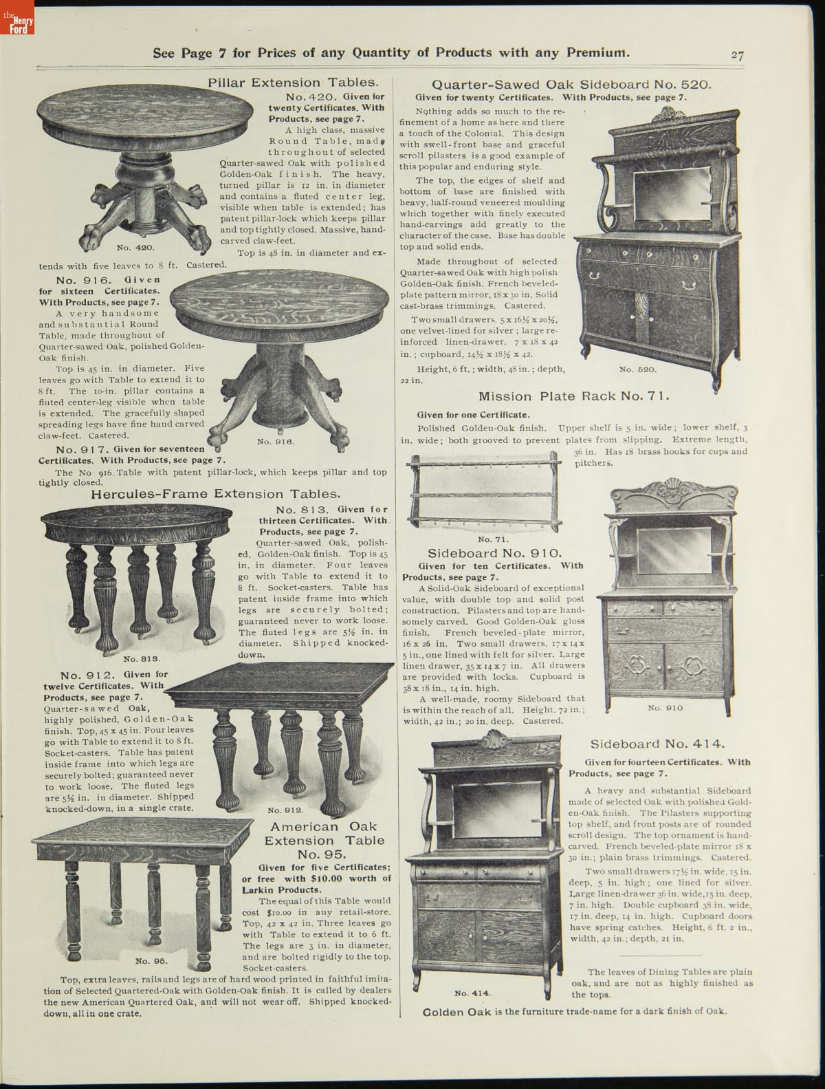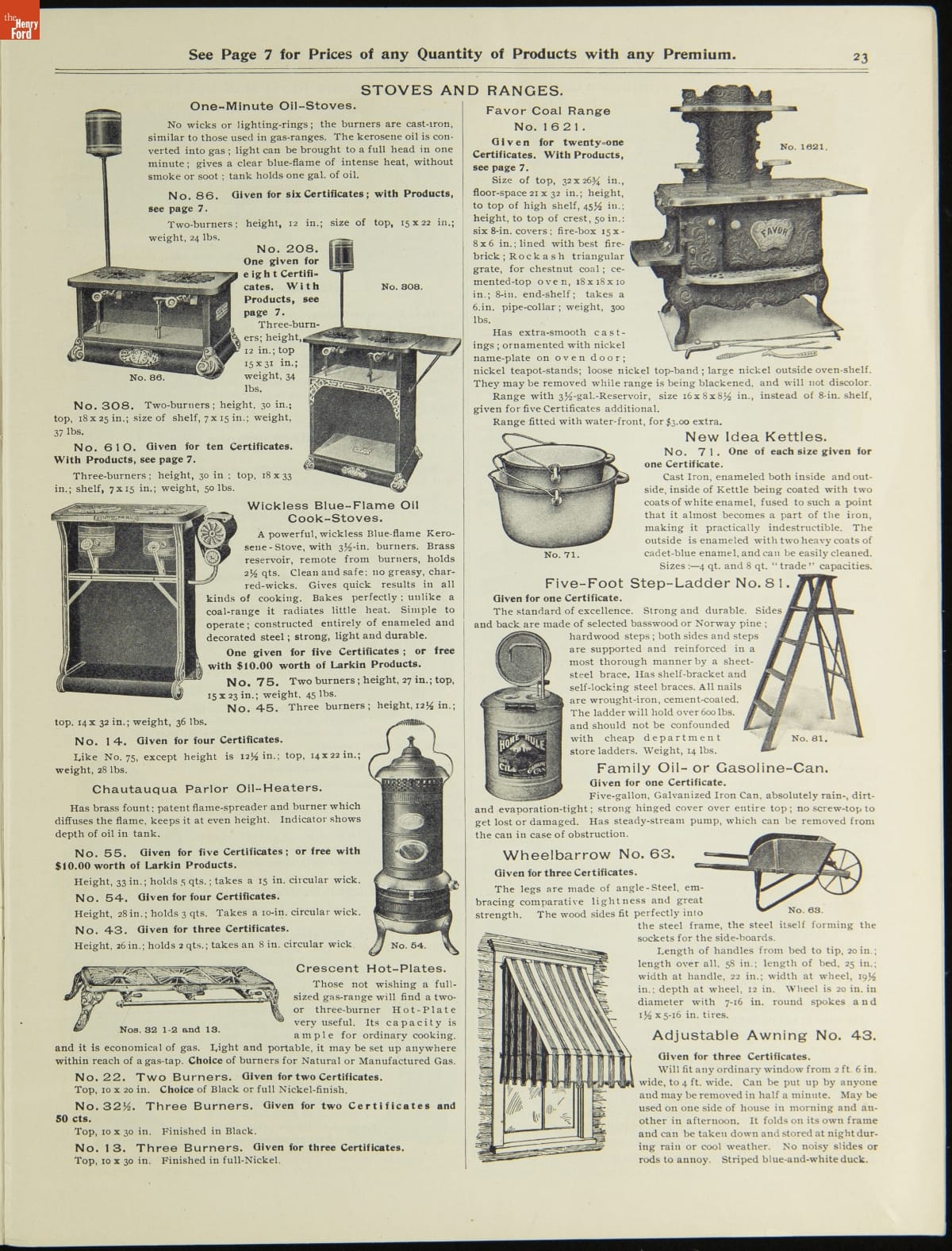 John D. Larkin established a soap manufacturing company in 1875. He hired his brother-in-law, Elbert Hubbard, as a salesman. Hubbard developed "The Larkin Idea," a plan that sold goods directly to consumers through mail-order catalogs and offered incentivizing giveaways. It was a success. By the early 1900s, Larkin's catalogs contained pages of products and even more pages of premiums from which customers could choose.