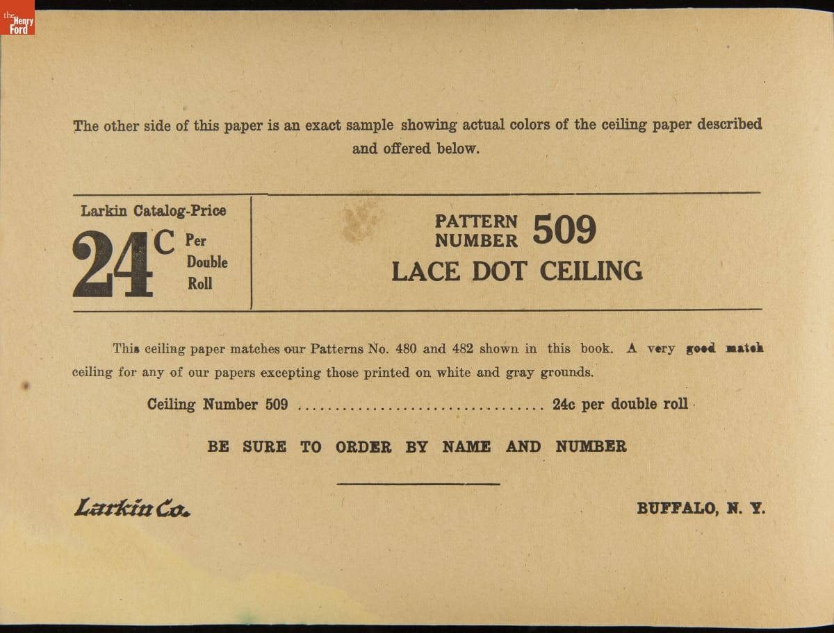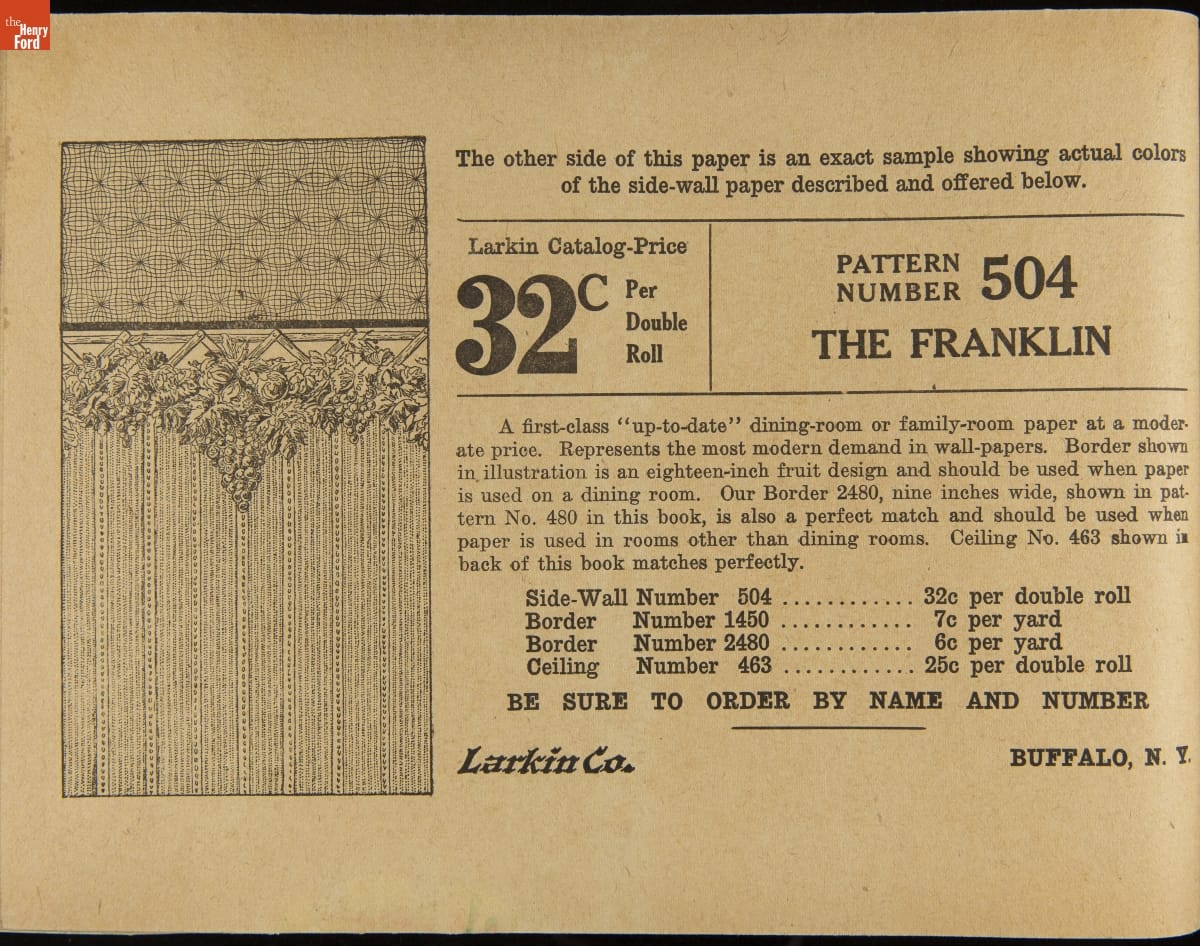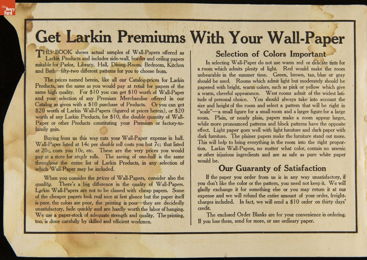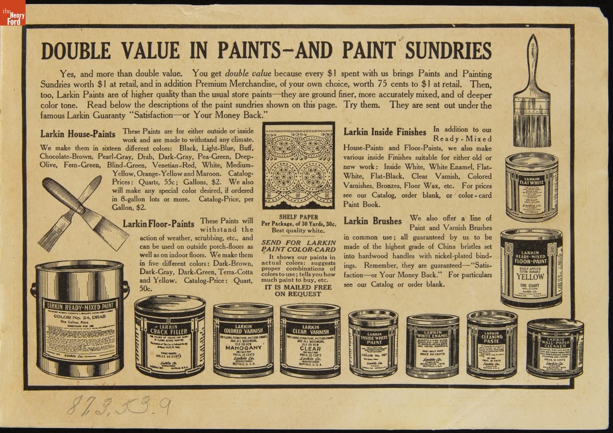 John D. Larkin established a soap manufacturing company in 1875. He hired his brother-in-law, Elbert Hubbard, as a salesman. Hubbard developed "The Larkin Idea," a plan that sold goods directly to consumers through mail-order catalogs and offered incentivizing giveaways. It was a success. By the early 1900s, Larkin's catalogs contained pages of products and even more pages of premiums from which customers could choose.