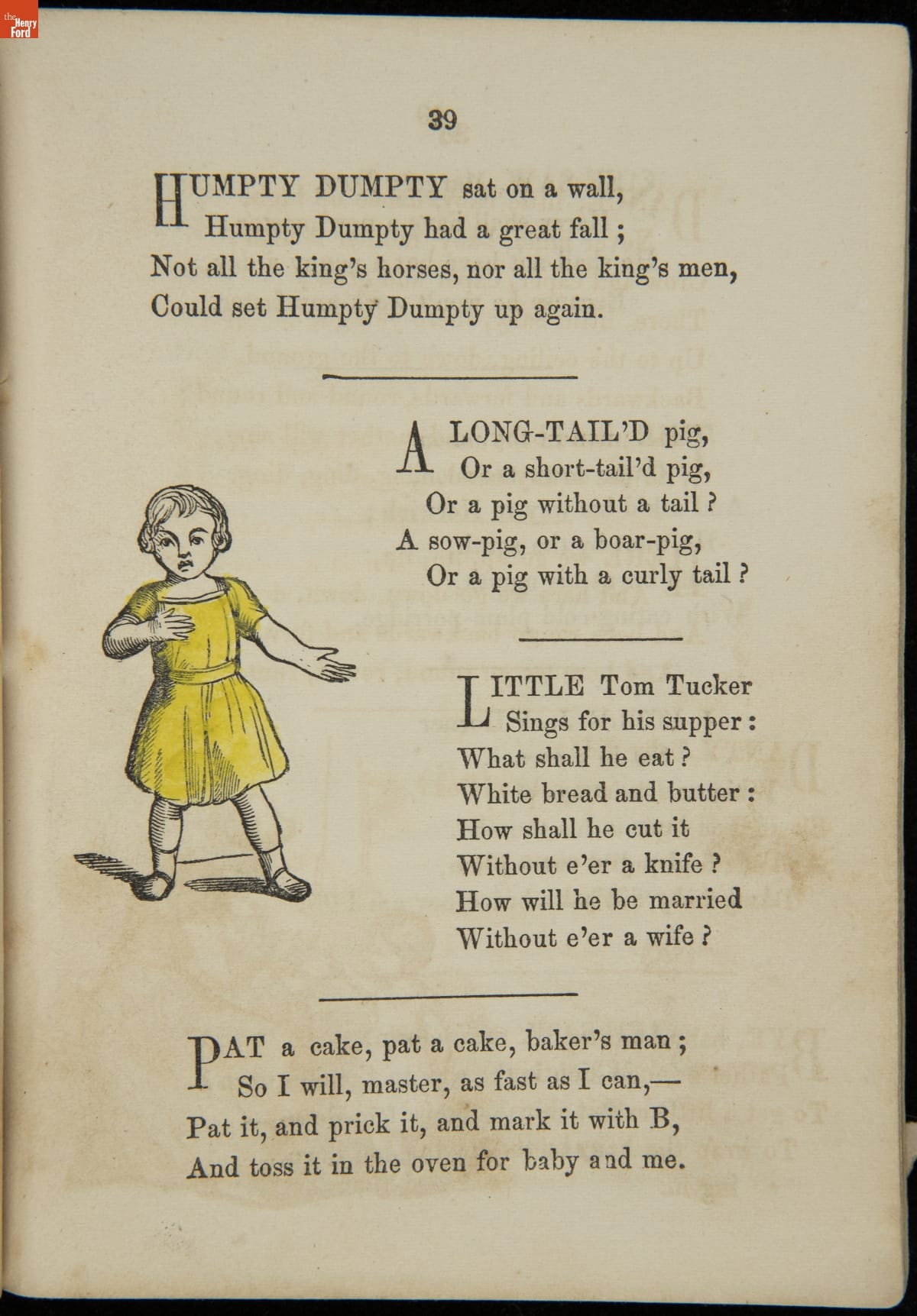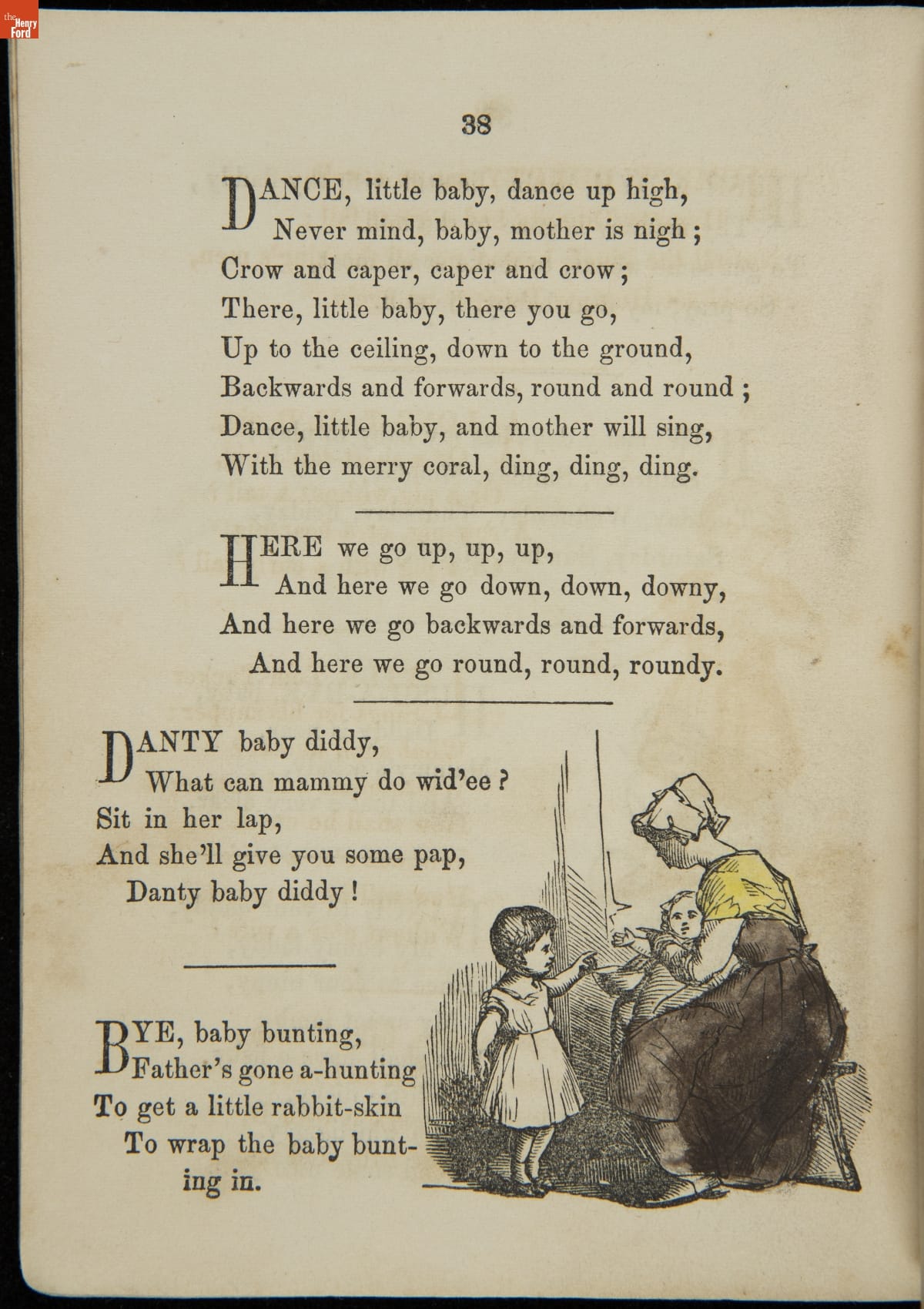 As a teenager in the 1840s, John McLoughlin, Jr. (1827-1905) learned wood engraving and printing at his father's New York publishing firm. Around 1850, he took over the business and began publishing books, like this copy of "Mother Goose Melodies," under his own name. Hand-colored illustrations accompany a few of the traditional nursery rhymes that fill the book's pages.
