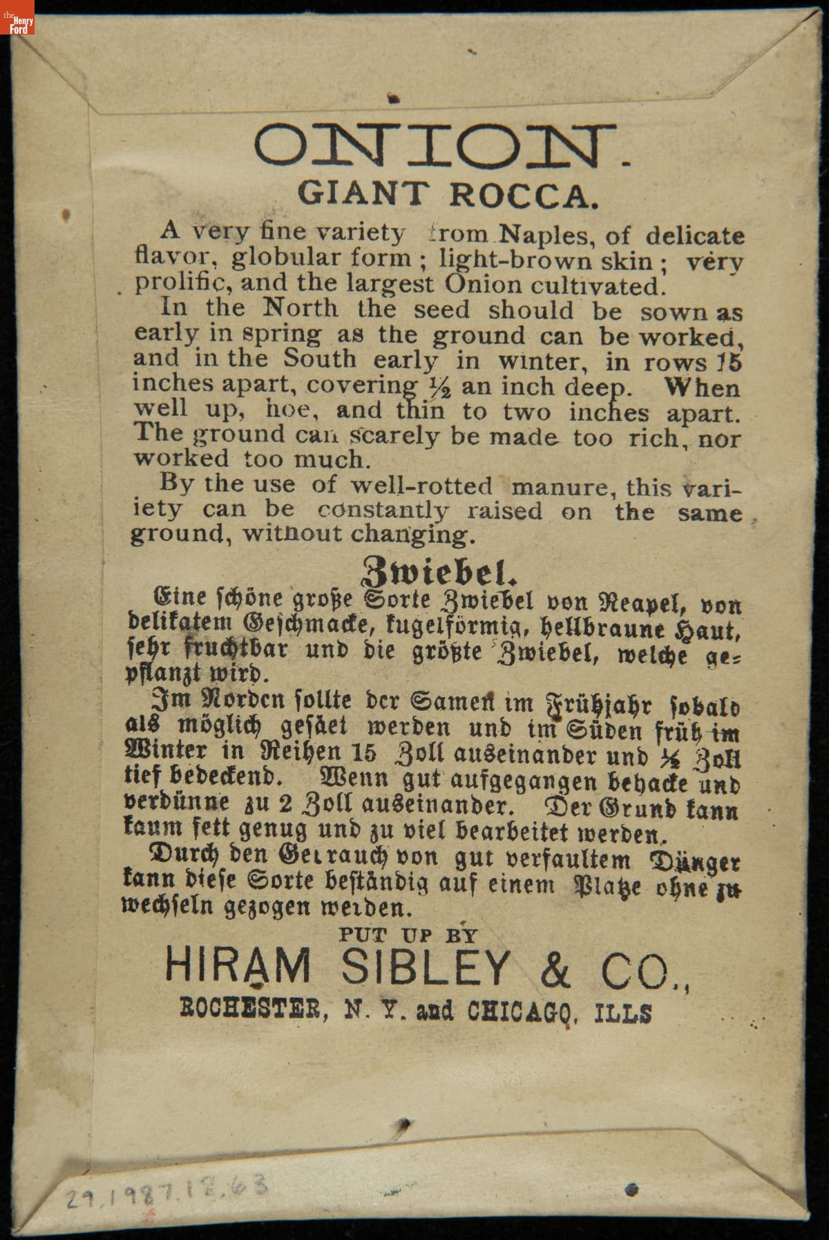 on front: ONION / GIANT ROCCA / SEND FOR OUR ILLUSTRATED CATALOGUE... / HIRAM SIBLEY & CO. / ROCHESTER, N.Y. & CHICAGO, ILL.