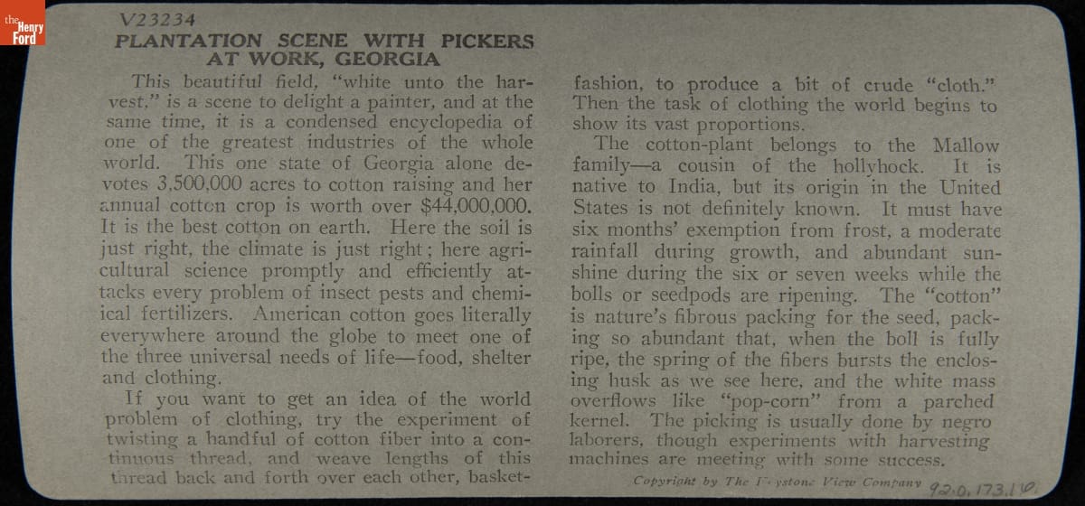 front, right side: Keystone View Company / Copyrighted, Underwood & Underwood / Manufacturers / MADE IN U.S.A. / Publishers front, top: 26 front, left side: Meadville, Pa., New York, N.Y. / Chicago, Ill., London, England front, bottom: V23234--Cotton is King--Plantation Scene with Pickers at / Work, Georgia