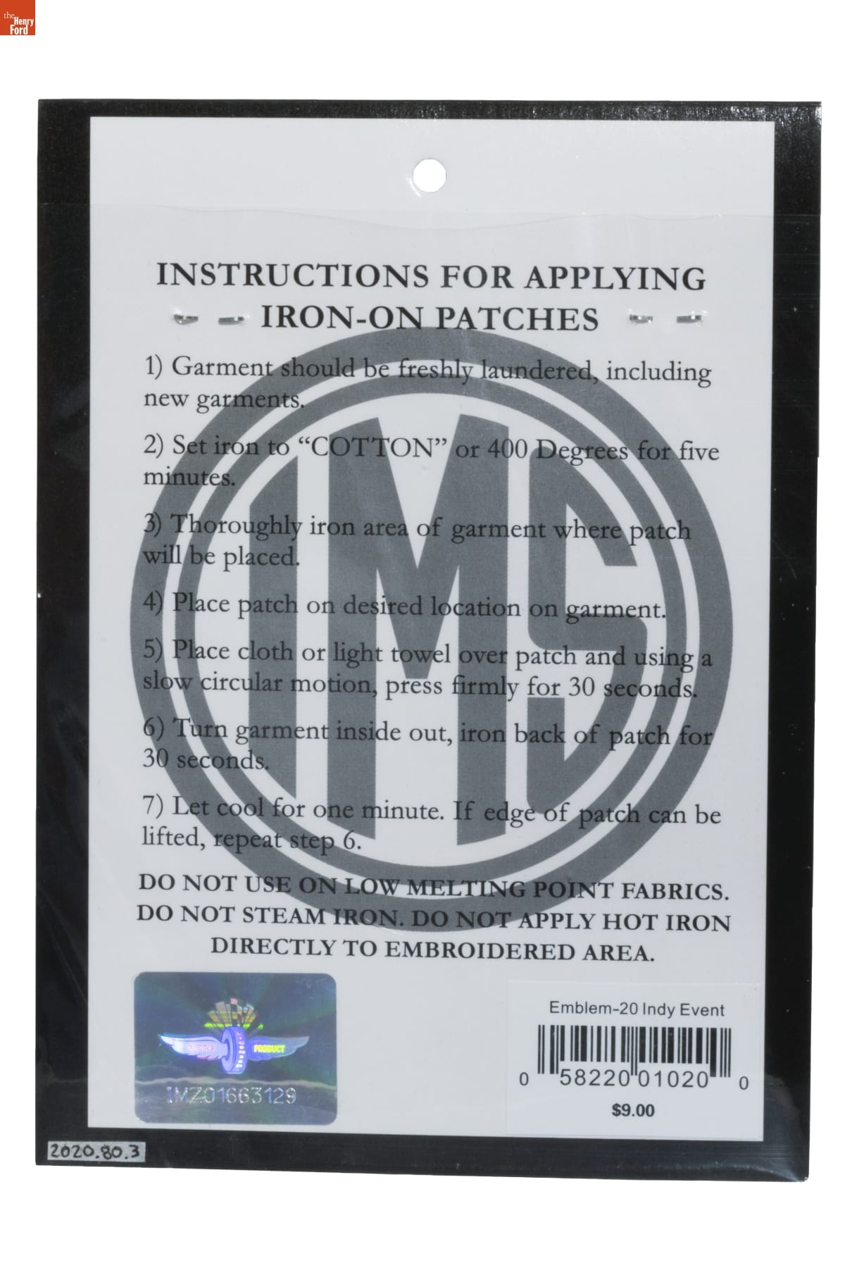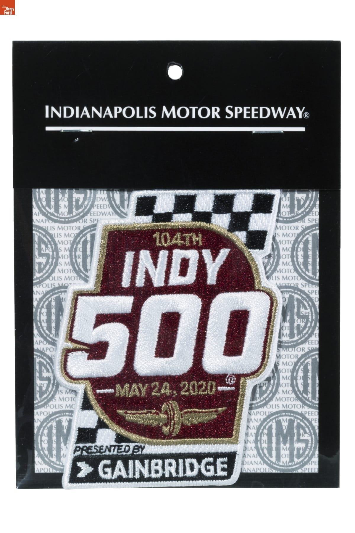 on front of patch: 104TH / INDY / 500 / MAY 24, 2020 / PRESENTED BY / GAINBRIDGE on front of packaging: INDIANAPOLIS MOTOR SPEEDWAY(R) ón back of packaging: INSTRUCTIONS FOR APPLYING / IRON-ON PATCHES / 1) Garment should be freshly laundered, including new garments. / 2) Set iron to "COTTON" or 400 Degrees for five minutes. / 3) Thoroughly iron area of garment where patch will be placed. / 4) Place patch on desired location on garment. / 5) Place cloth or light towel over patch and using a slow circular motion, press firmly for 30 seconds. / 6) Turn garment inside out, iron back of patch for 30 seconds. / 7) Let cool for one minute. If edge of patch can be lifted, repeat step 6. / DO NOT USE ON LOW MELTING POINT FABRICS. / DO NOT STEAM IRON. DO NOT APPLY HOT IRON DIRECTLY TO EMBROIDERED AREA.