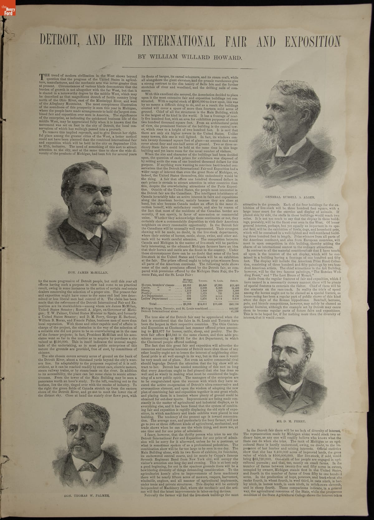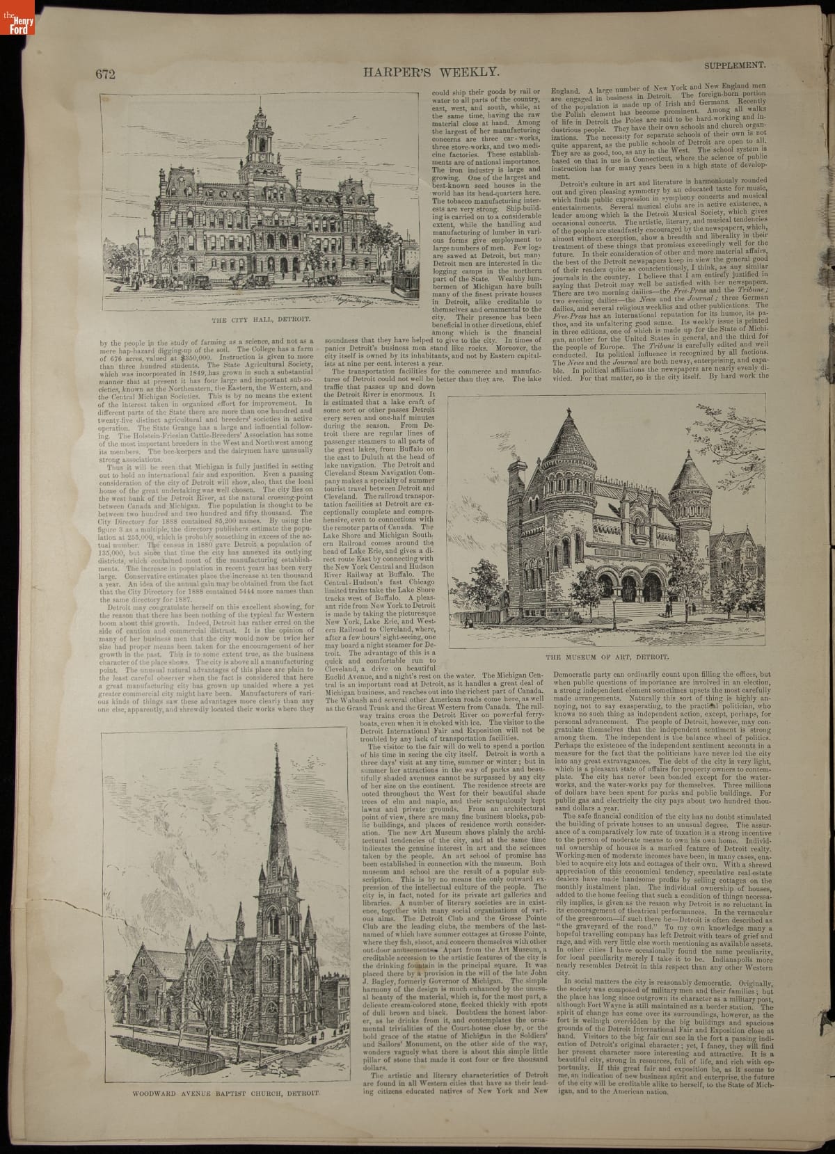 Readers of Harper's Weekly could find news, fictional works, essays, and illustrations depicting life in America and from around the world. This August 17, 1889, issue included an article entitled "Detroit, and Her International Fair and Exposition." The article featured a general view of the fairgrounds and depictions of other city buildings -- including Detroit's City Hall and the Central Market.