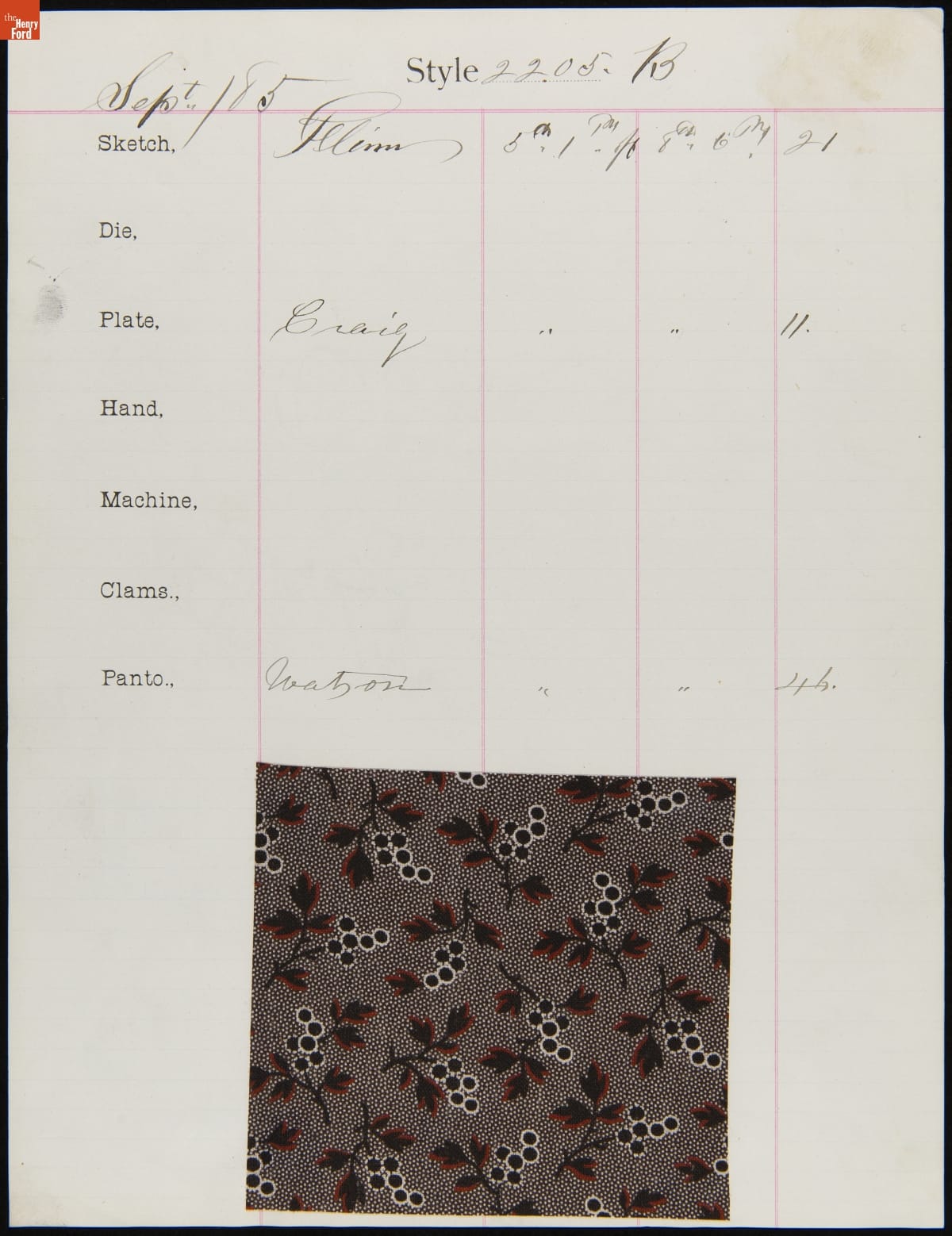 Engraver Sheet for Textile Fabric Style No. 2205 B, Cocheco Mfg. Co., September 1885