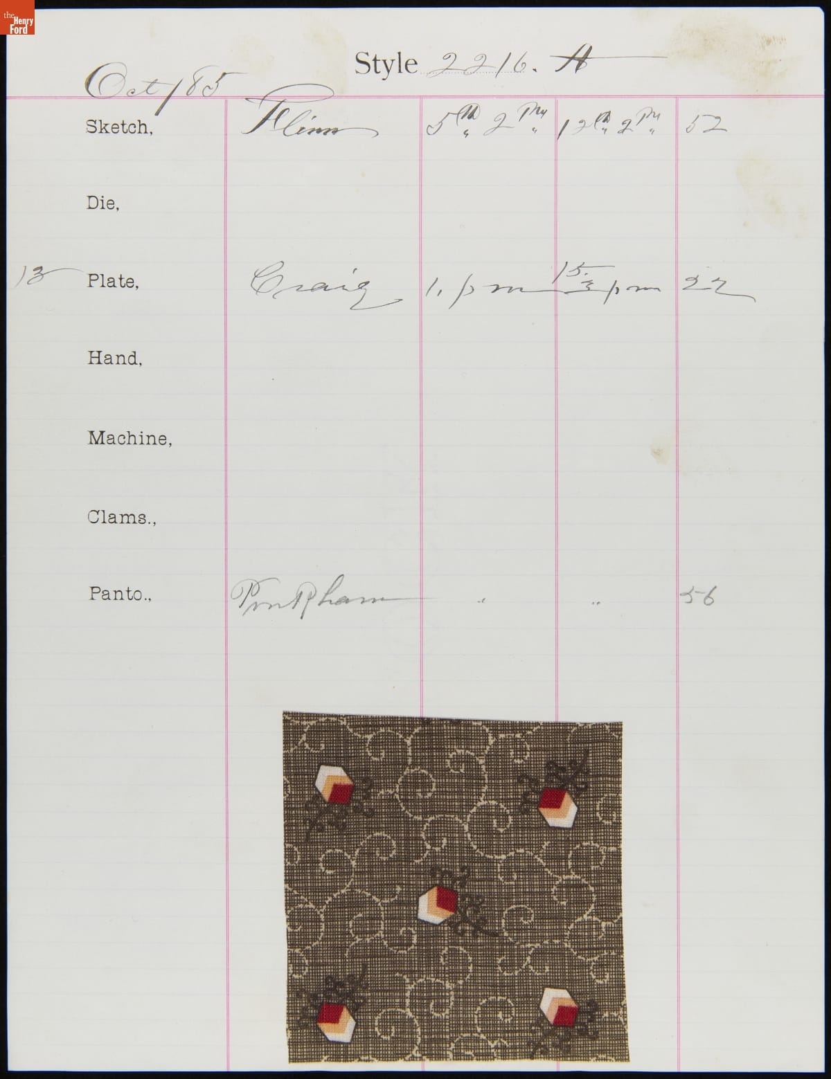 Engraver Sheet for Textile Fabric Style No. 2216 A, Cocheco Mfg. Co., October 1885