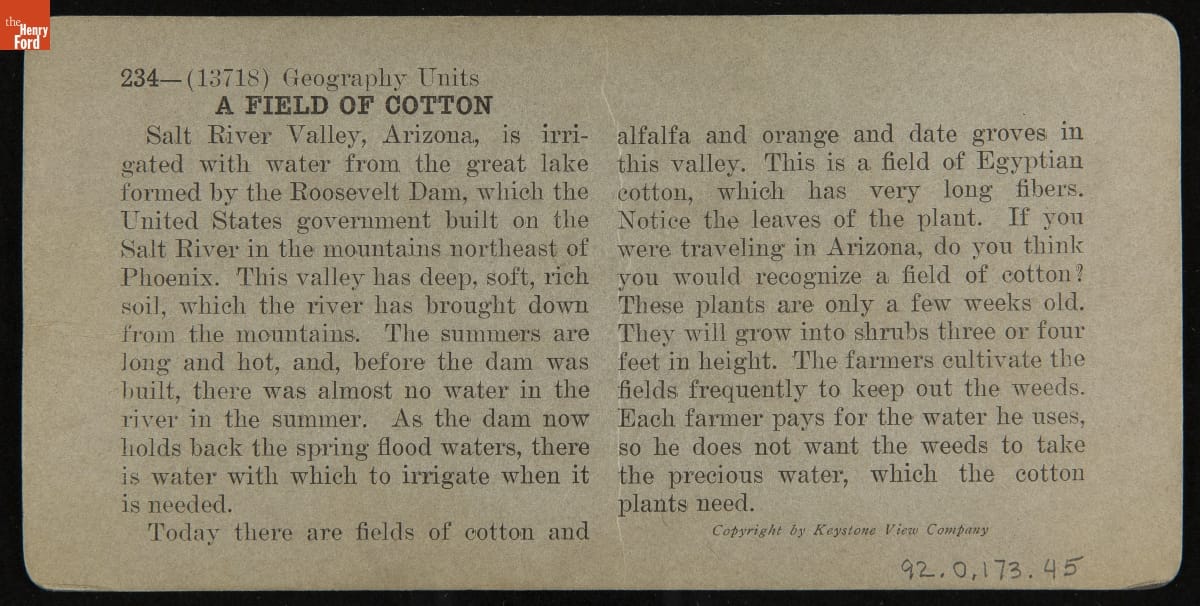 on left side: Keystone View Company / Manufacturers Publishers / Copyrighted / Made in U.S.A. on top center: 234 / G on right side: Meadville, Pa., New York, N.Y. / Chicago, Ill., London, England on bottom right: 13718 A Field of Cotton