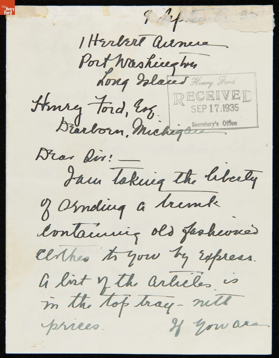Letter from E. Louise Hungerford to Henry Ford Offering to Sell a Trunk with "Old Fashioned Clothes," September 9, 1935