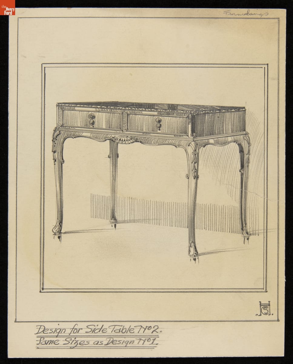 Sidney Houghton was a London-based interior designer, who met Henry Ford during World War I. Houghton worked on Ford's "Eagle Boats," supplied to the U.S. and British Navies. Following the War, Ford commissioned Houghton to create a variety of interiors. Houghton submitted this rendering to Clara Ford for the interiors of Fair Lane, the Ford Estate in Dearborn, Michigan.