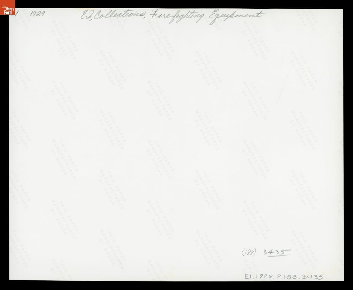 Firefighting equipment was an early focus of collecting efforts at The Henry Ford. This photograph shows a mock-up for a firefighting exhibit tested at Ford Motor Company's Engineering Laboratory -- where Henry Ford stored many of his artifacts before the museum opened. Buckets, helmets, trumpets, and tools are all visible in the display.