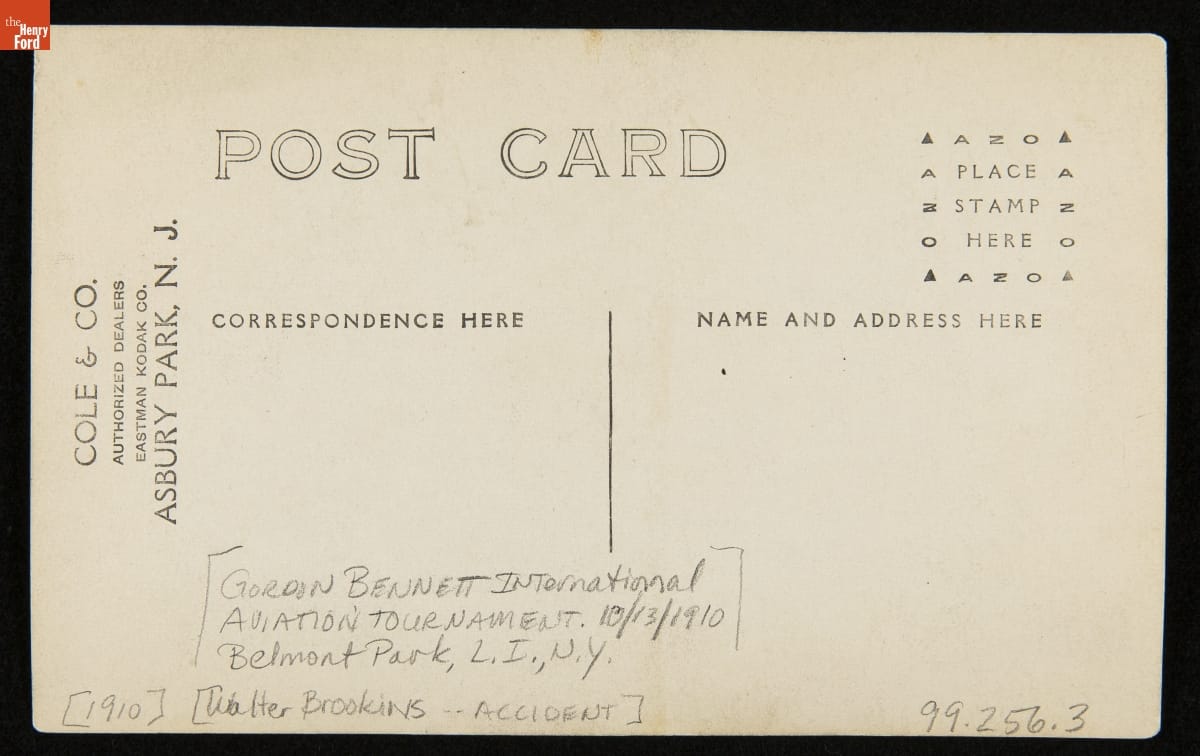 Walter Brookins grew up in Dayton, Ohio, and was a student of Katharine Wright's. He joined the Wright brothers' exhibition flying team and, on July 10, 1910, became the first person to fly at an altitude over one mile high. Brookins survived a crash at the 1910 Gordon Bennett Air Race when the V-8 engine in his Wright "Baby Grand" airplane failed.