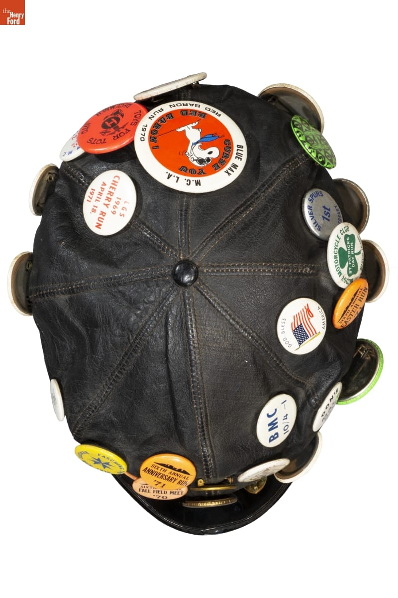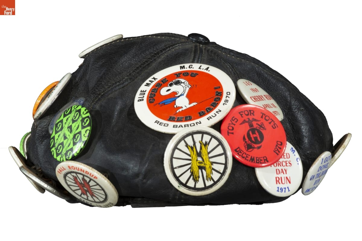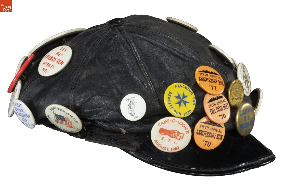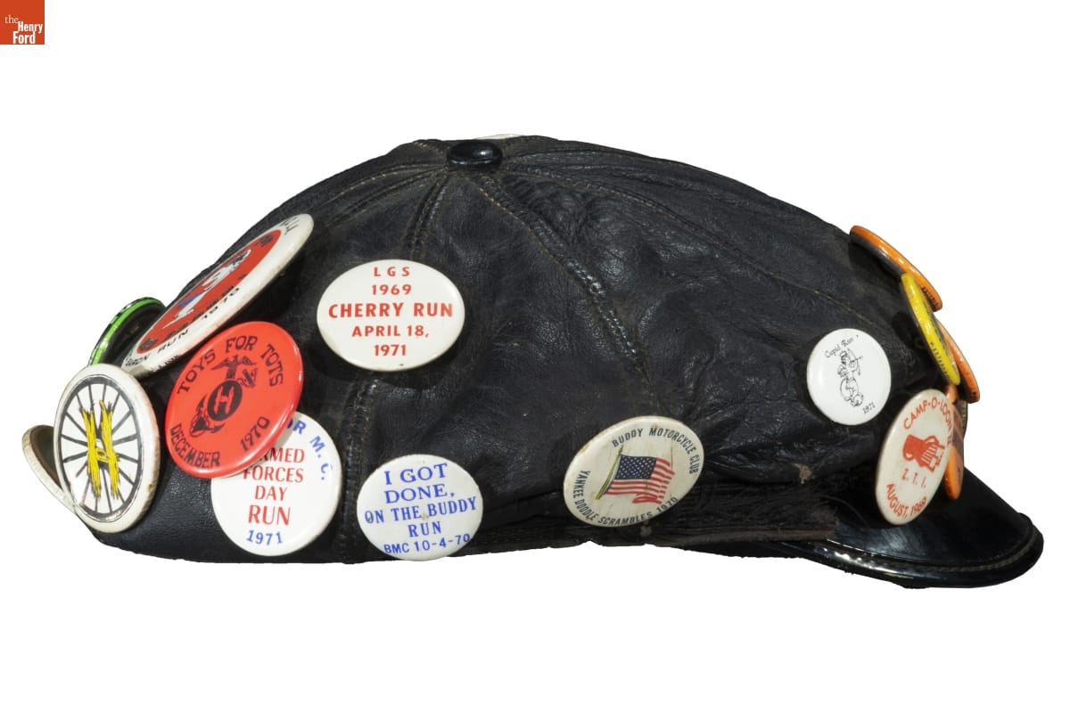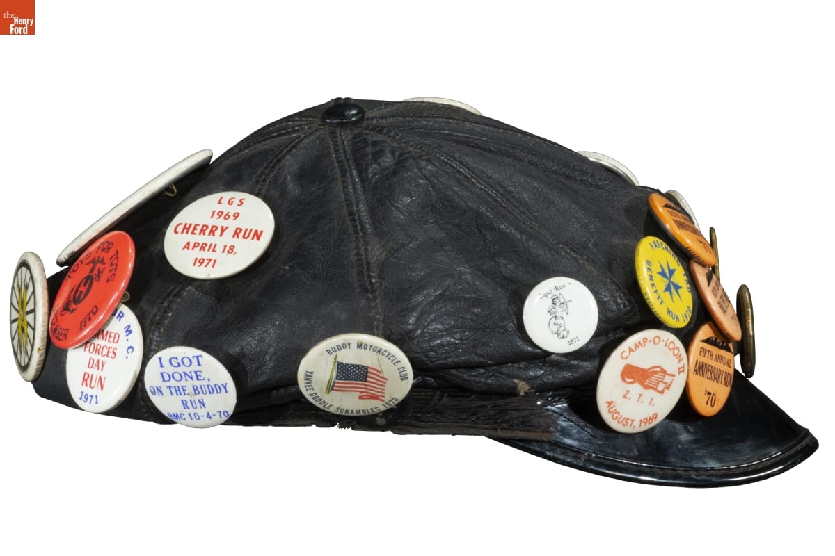 Motorcycle Cap with Buttons Commemorating LGBTQ+ Events and Places, 1969-1971