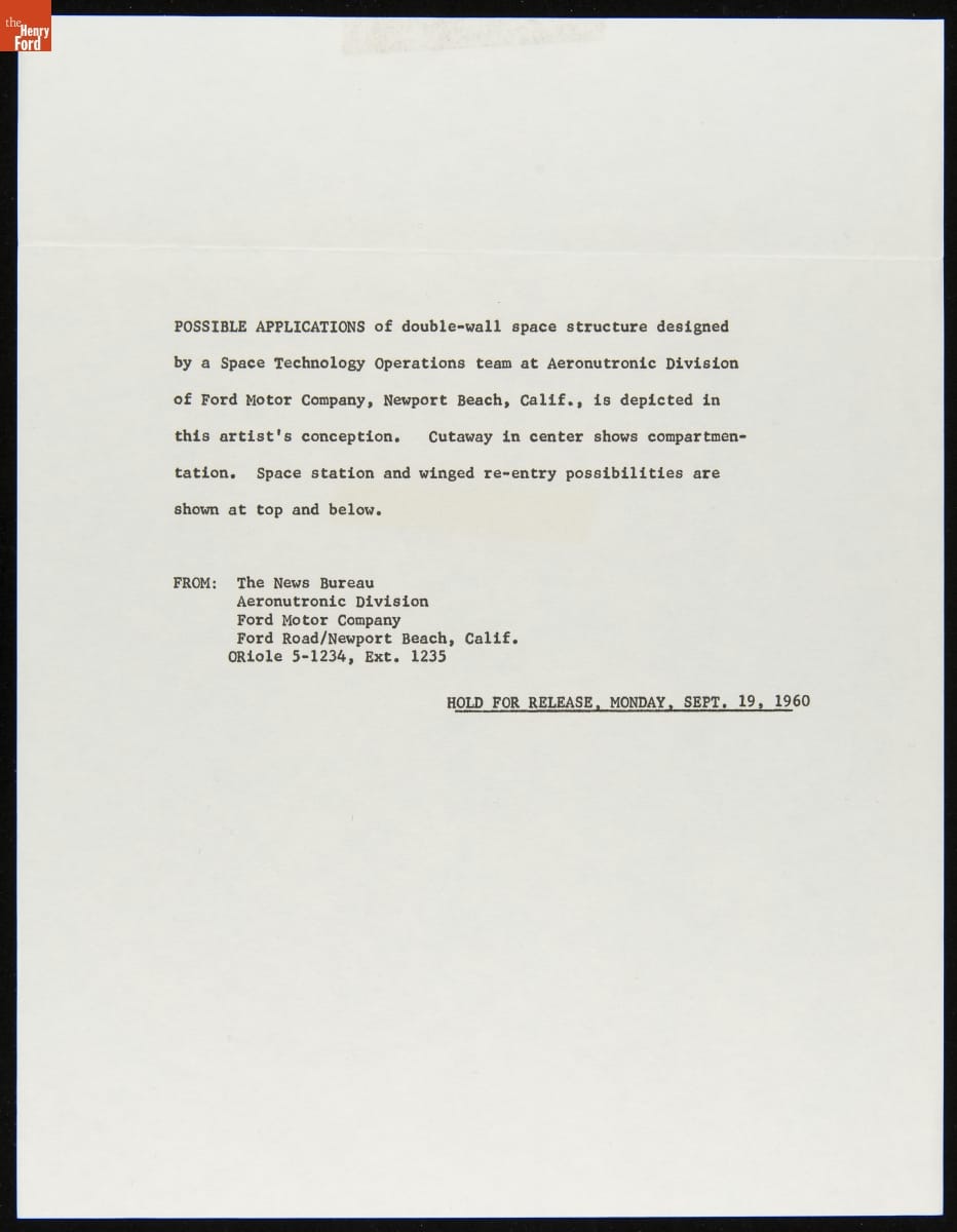 Space Station Concept by Aeronutronic Division of Ford Motor Company, September 19, 1960