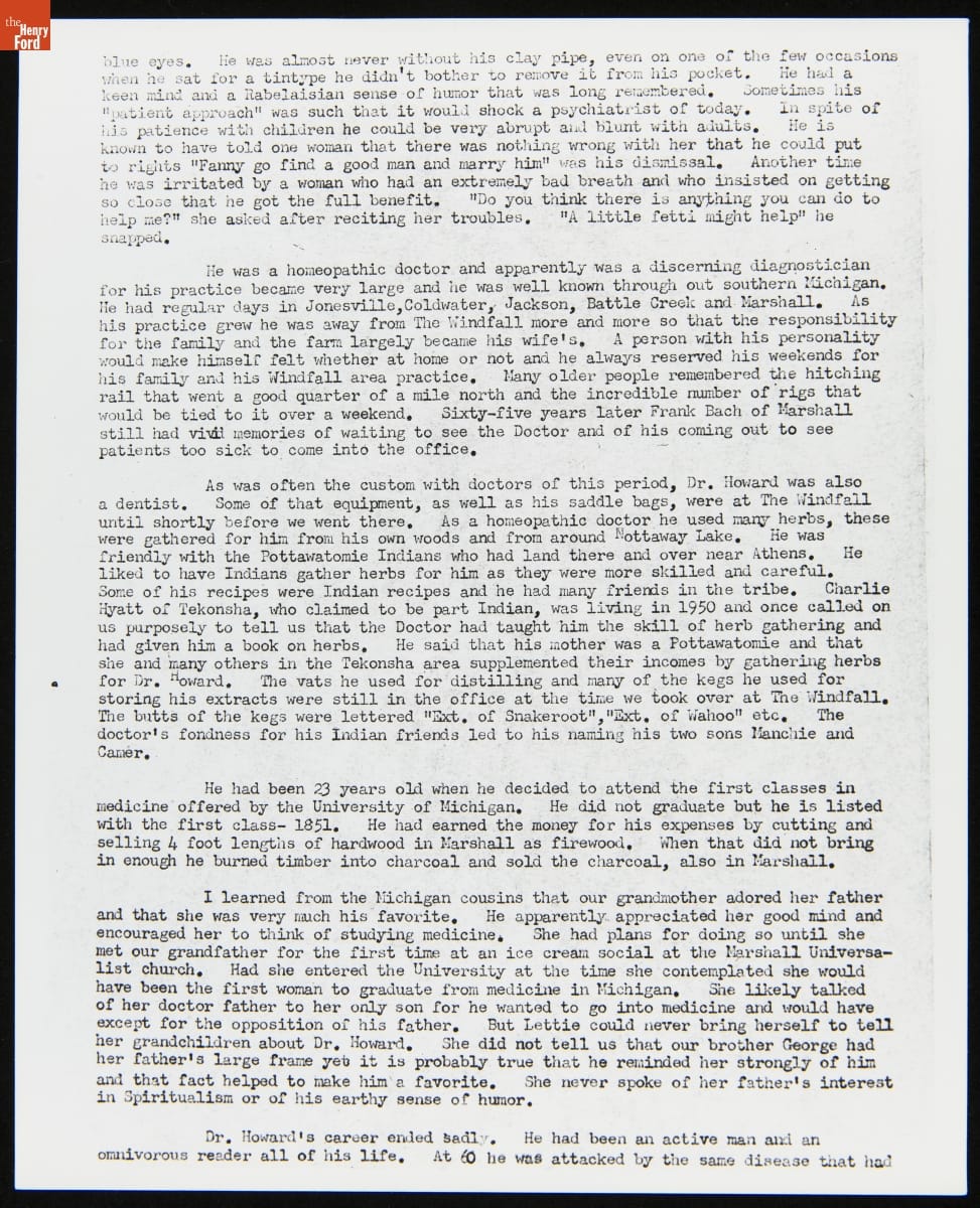 Alonson Howard, Jr. (1823-1883) studied medicine in Ohio and Michigan before setting up a medical practice in the 1850s in Tekonsha Township, Michigan. Dr. Howard performed surgeries, delivered babies, produced herbal remedies and homemade medicines, and treated illnesses--adapting his treatments to what worked best for his patients. He served his community for more than thirty years.