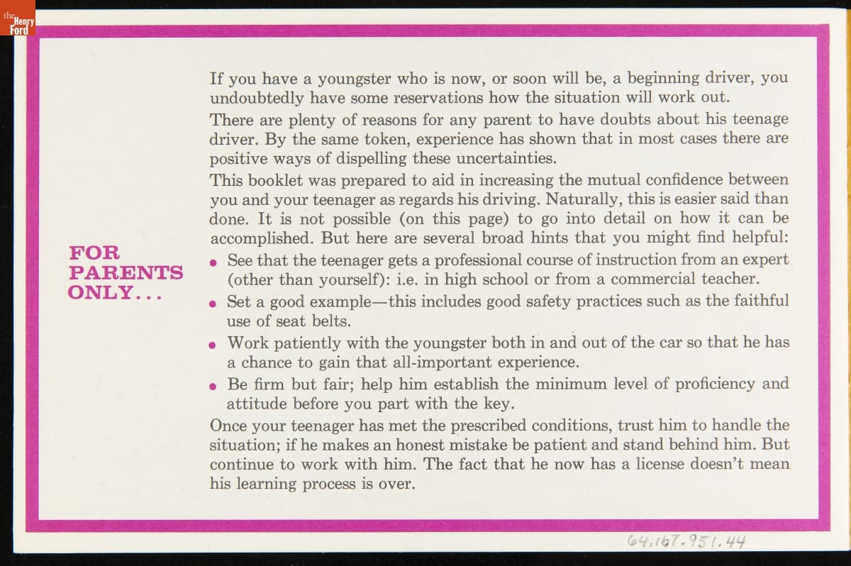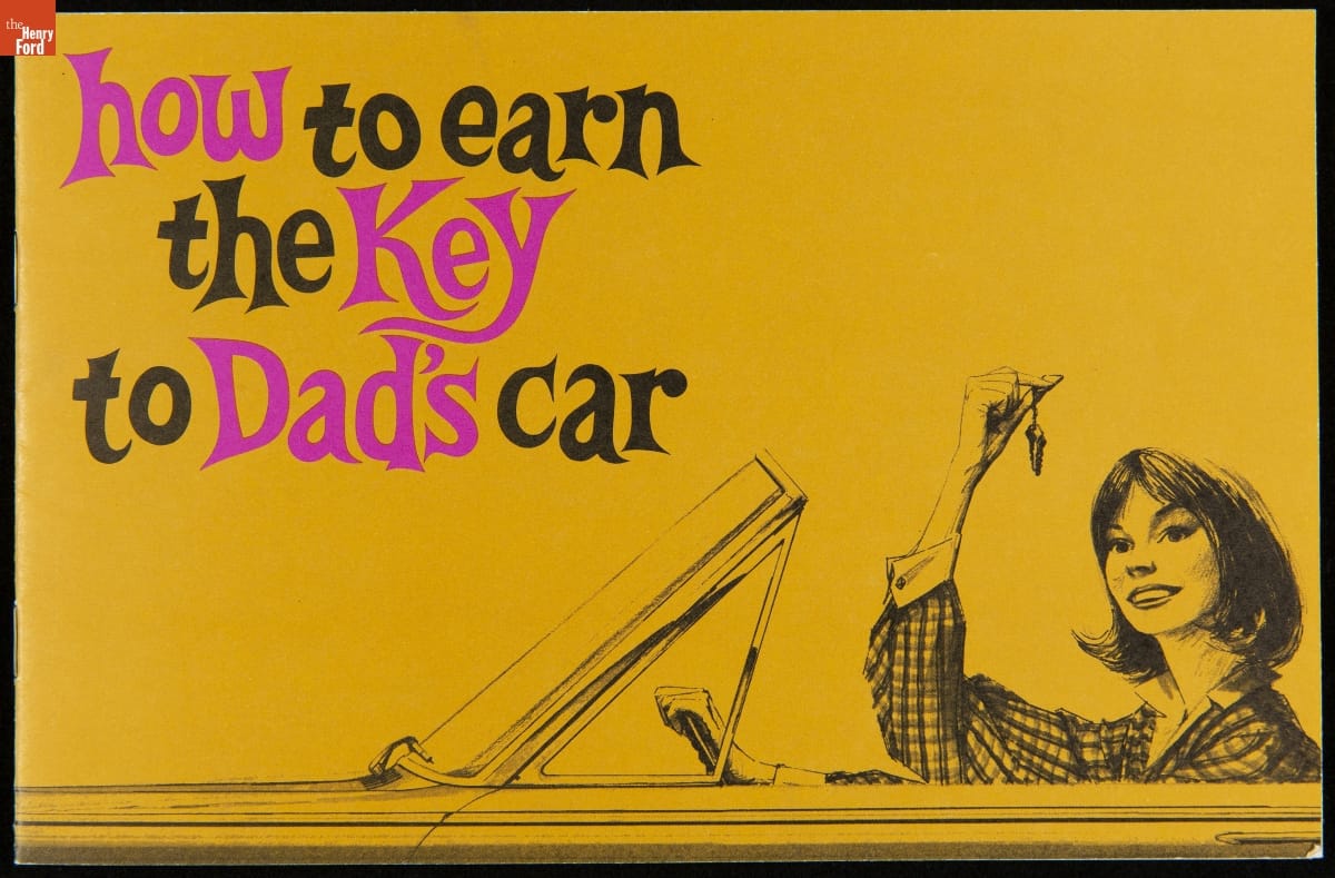 Ford Motor Company's Lincoln-Mercury Division published How to Earn the Keys to Dad's Car in 1966. It included advice to both teenagers and parents for safe and responsible driving. The booklet featured Colette Daiute, Miss Teenage America 1966 and youth safety spokesperson for Lincoln-Mercury. Automakers distributed guidebooks to high schools -- hoping that student drivers would someday become loyal customers.