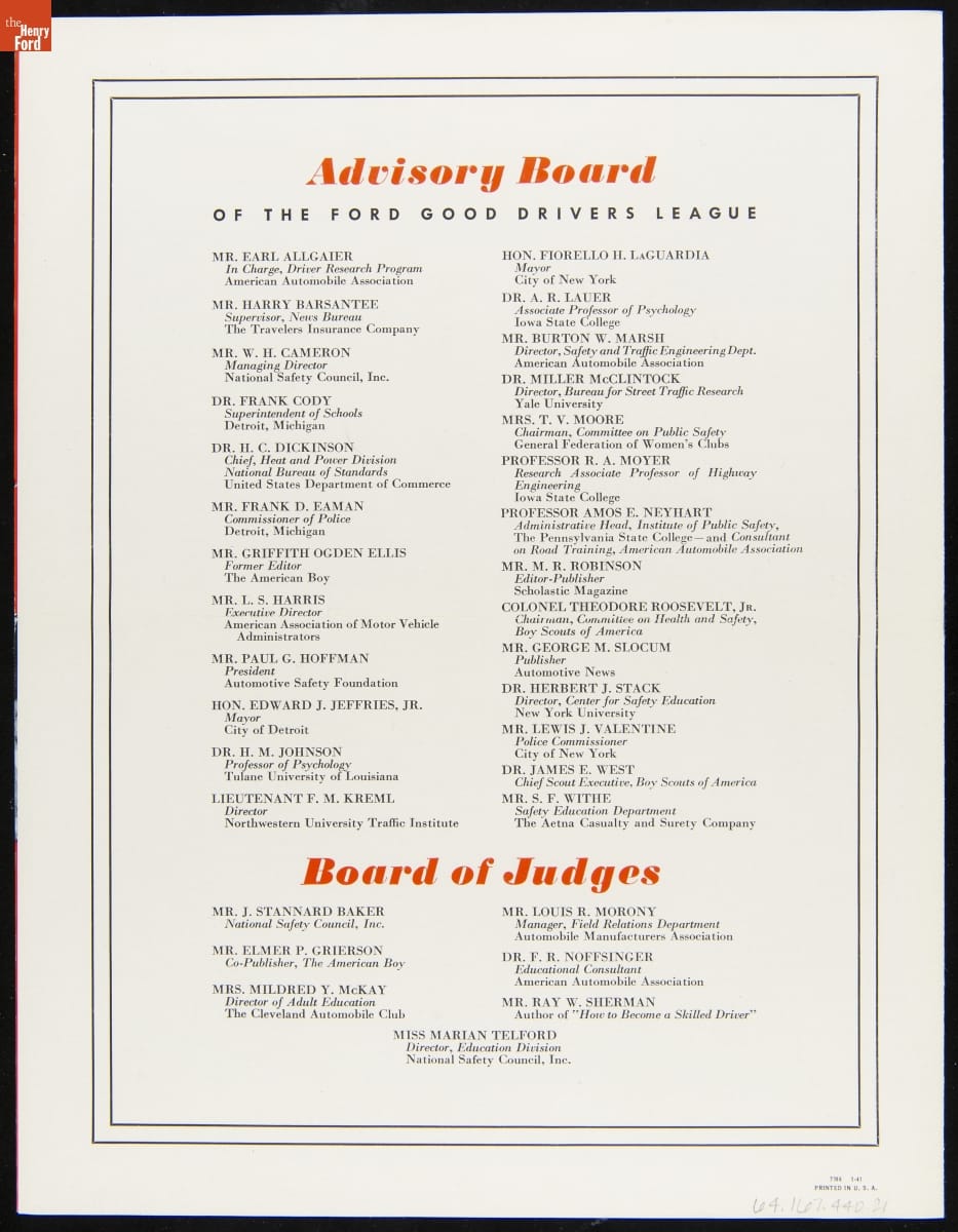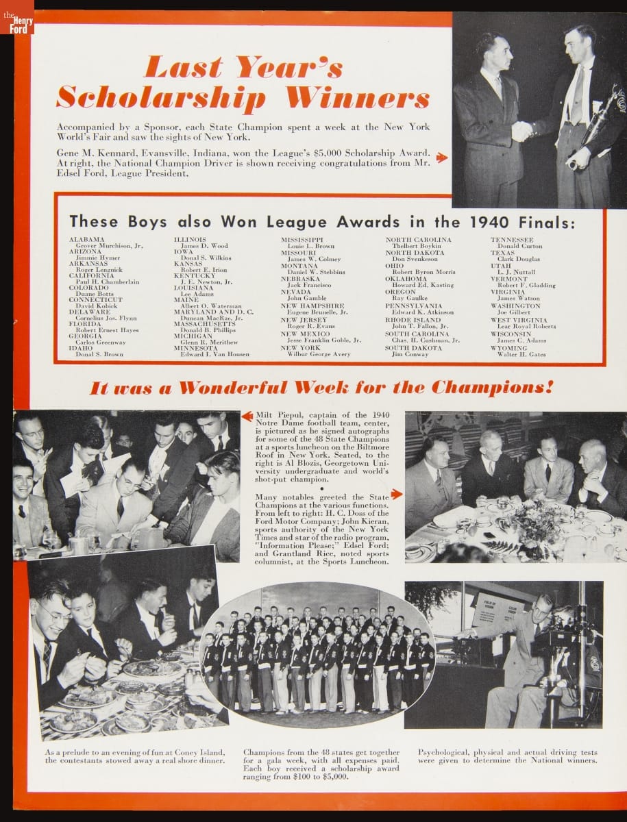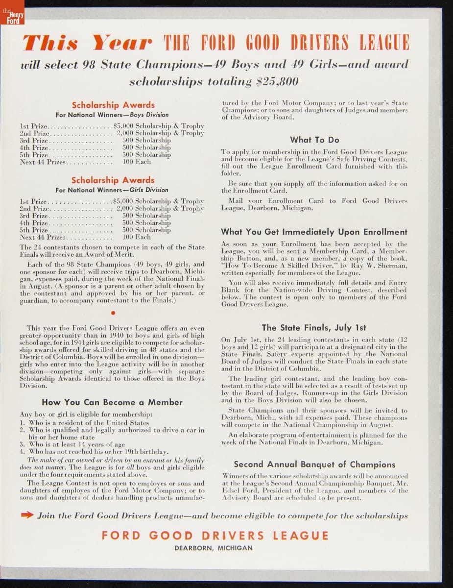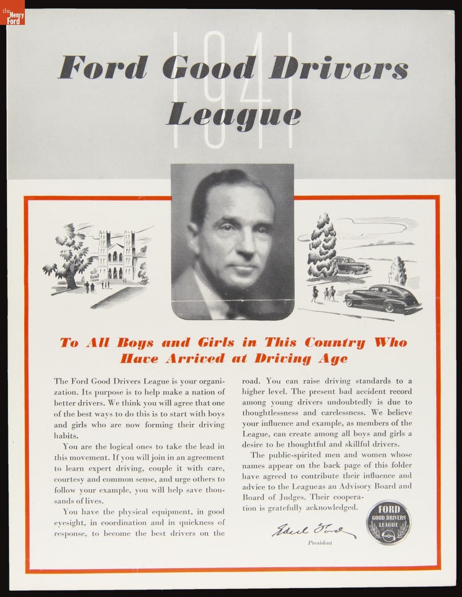 Ford Motor Company created the Good Drivers League in 1940. Headed by Edsel Ford, the League promoted safe driving habits among high school students. The League initially invited boys to compete in state and national championships--girls would join in 1941. Contestants wrote essays and participated in driving tests. National champions won trophies and scholarships. America's entry into World War II ended the program.