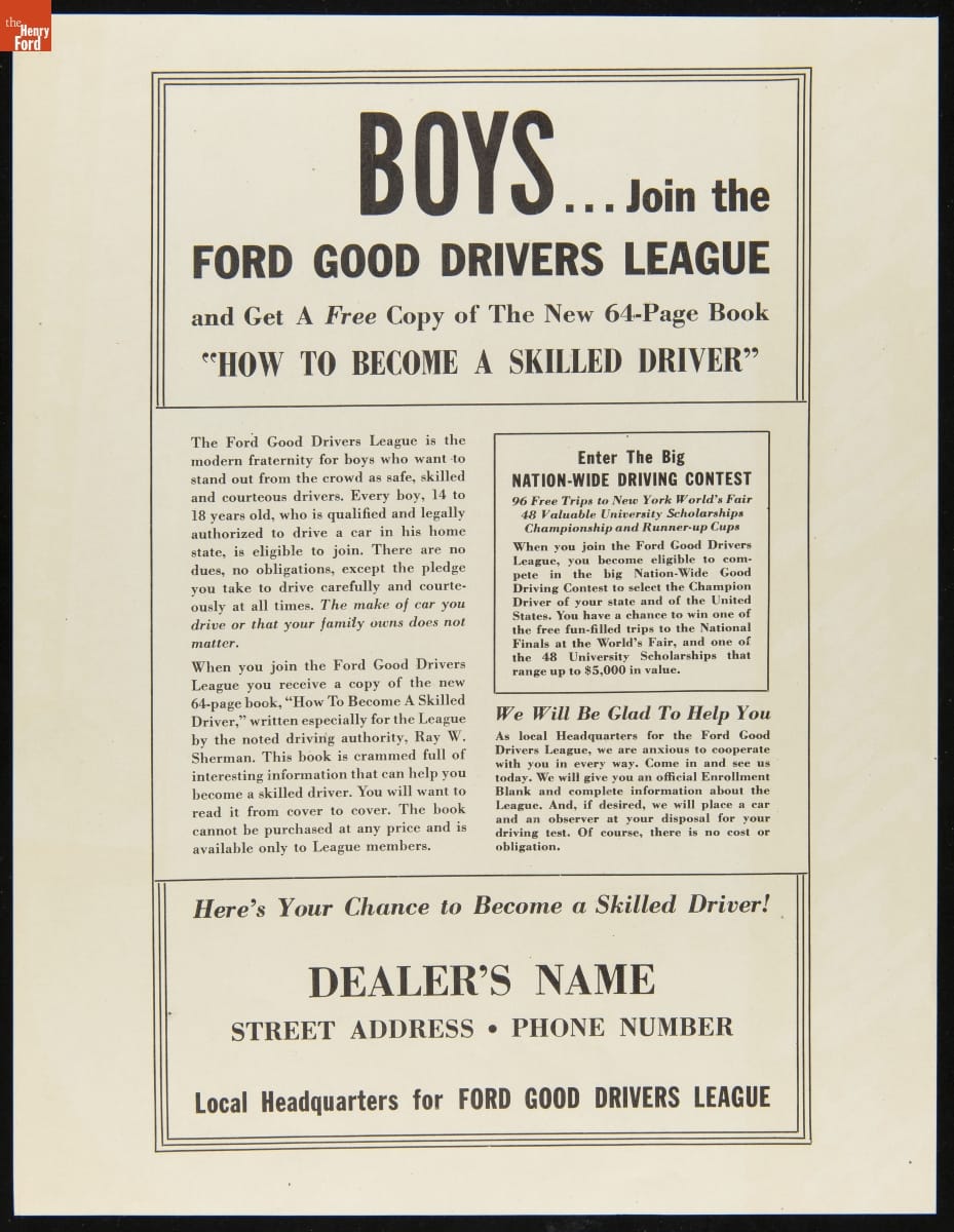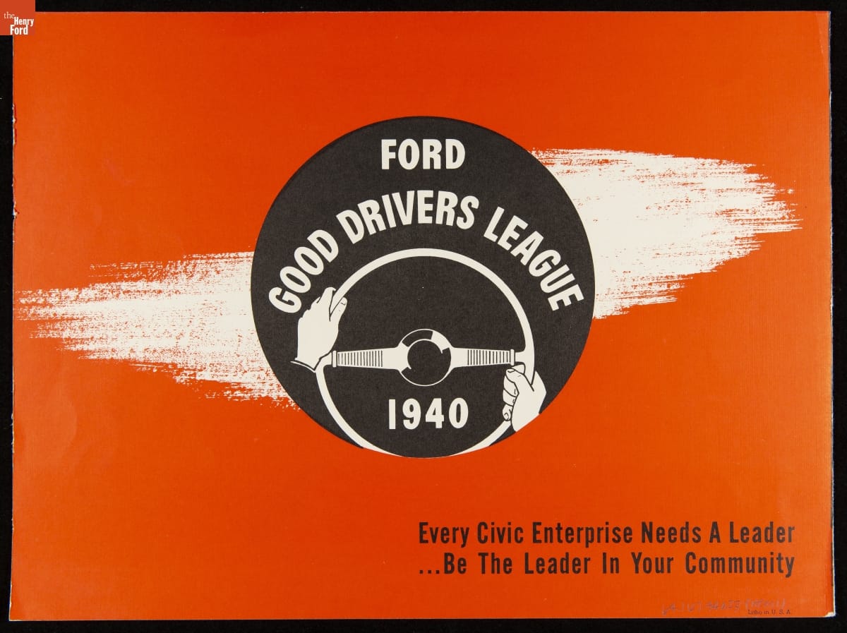 Ford Motor Company created the Good Drivers League in 1940. Headed by Edsel Ford, the League promoted safe driving habits among high school students. The League initially invited boys to compete in state and national championships--girls would join in 1941. Contestants wrote essays and participated in driving tests. National champions won trophies and scholarships. America's entry into World War II ended the program.