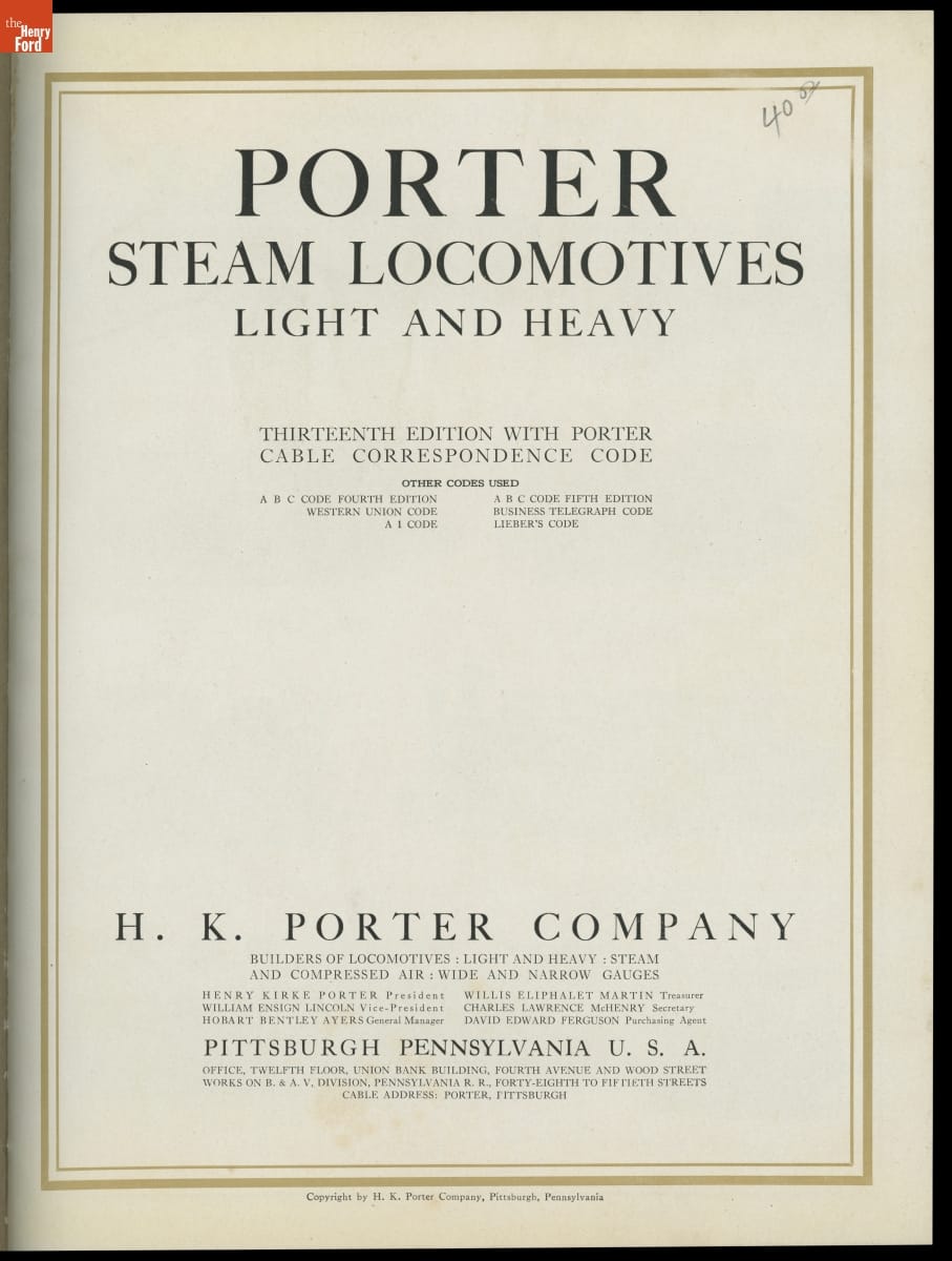 Founded in 1866, the H.K. Porter Company of Pittsburgh, Pennsylvania, built light industrial locomotives. These smaller engines were used in mines, mills, factories, construction sites, agricultural operations, and other specialized applications. Porter manufactured more than 8,000 steam, gasoline, and diesel-powered locomotives before exiting the business in 1950.
