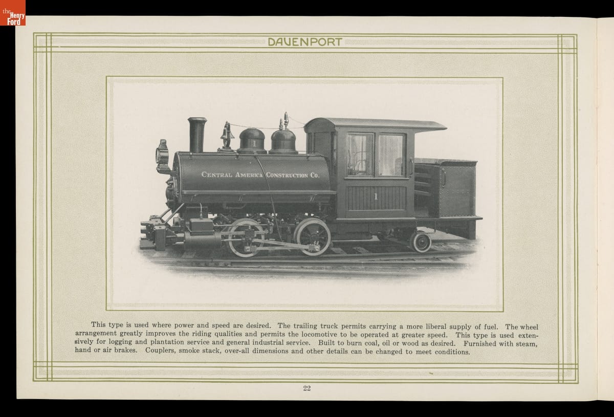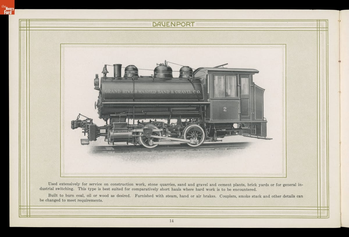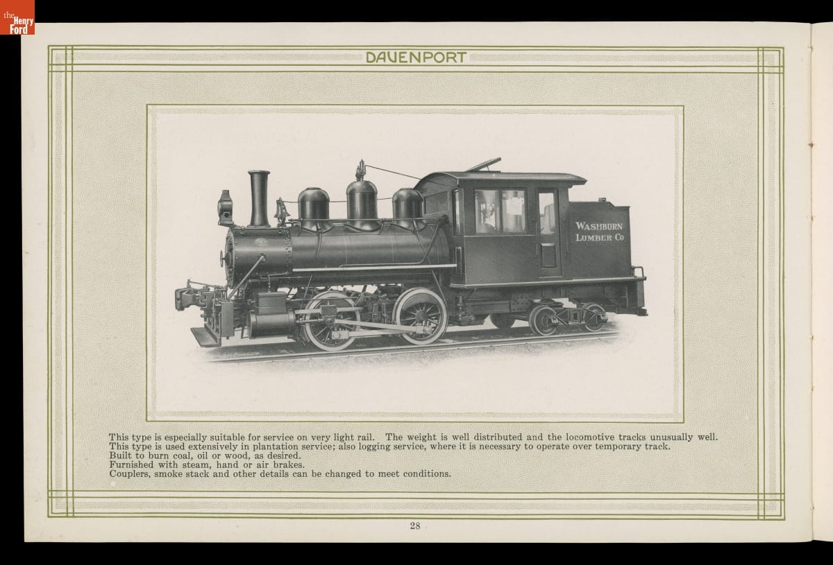 Iowa-based Davenport Locomotive Works built light industrial locomotives designed for mines, mills, factories, construction sites, agricultural operations, and other specialized applications. Davenport manufactured a wide range of steam, gasoline, diesel, and diesel-electric locomotives between 1902 and 1956. Several models were illustrated in this company catalog.