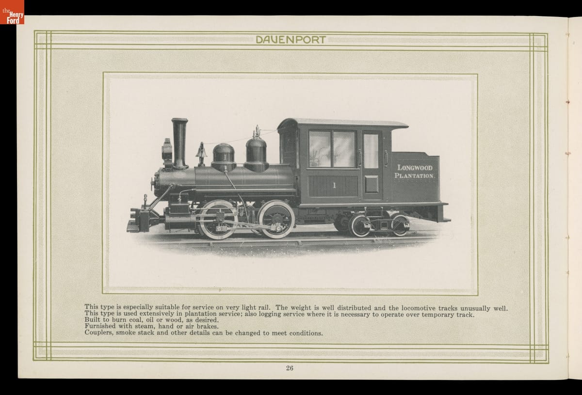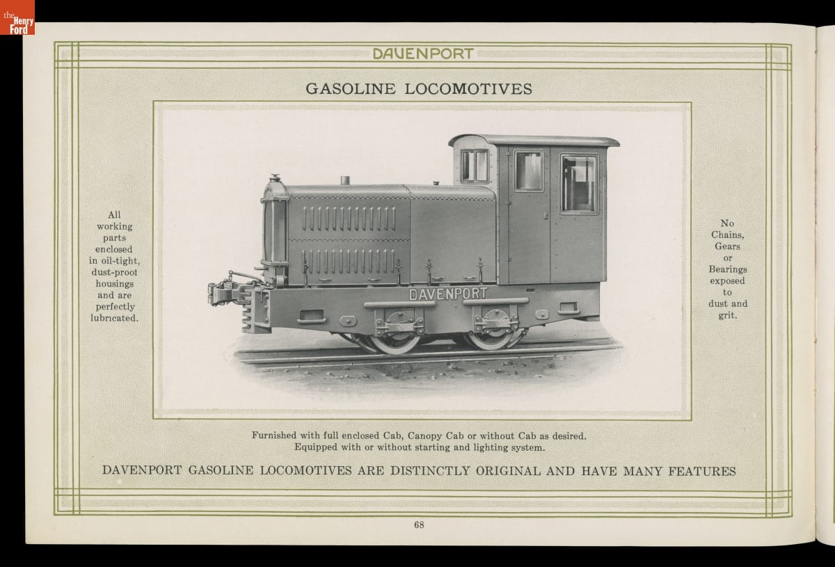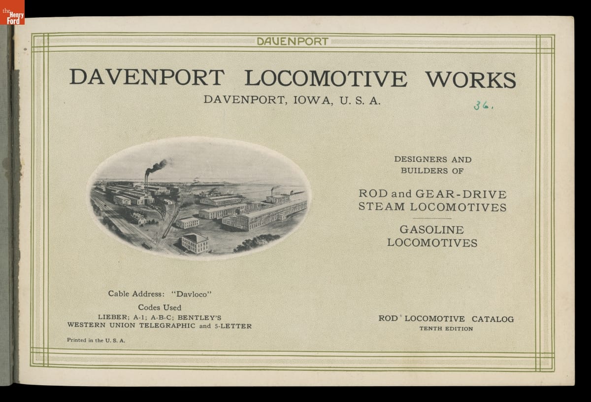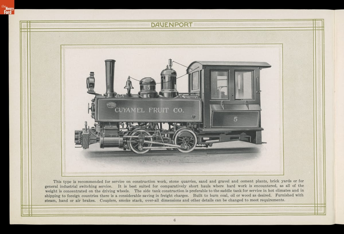 Iowa-based Davenport Locomotive Works built light industrial locomotives designed for mines, mills, factories, construction sites, agricultural operations, and other specialized applications. Davenport manufactured a wide range of steam, gasoline, diesel, and diesel-electric locomotives between 1902 and 1956. Several models were illustrated in this company catalog.