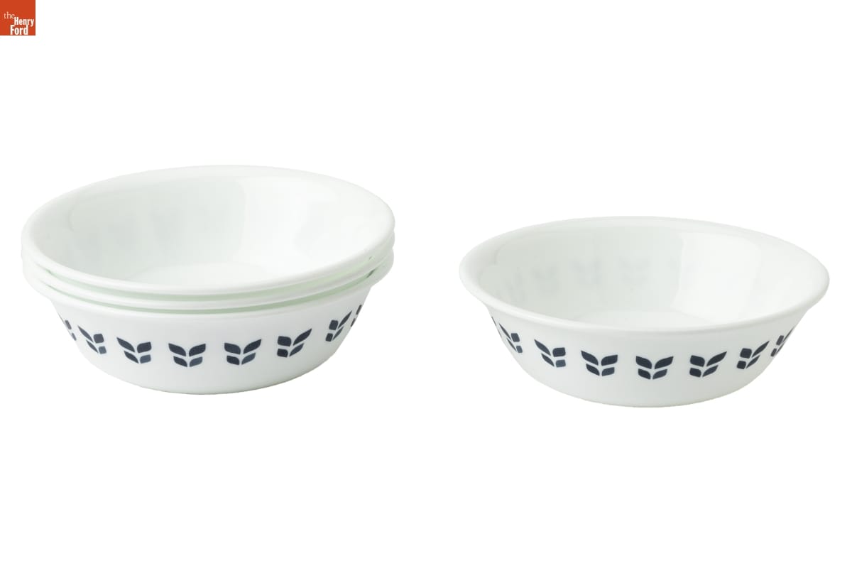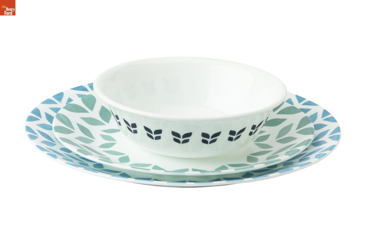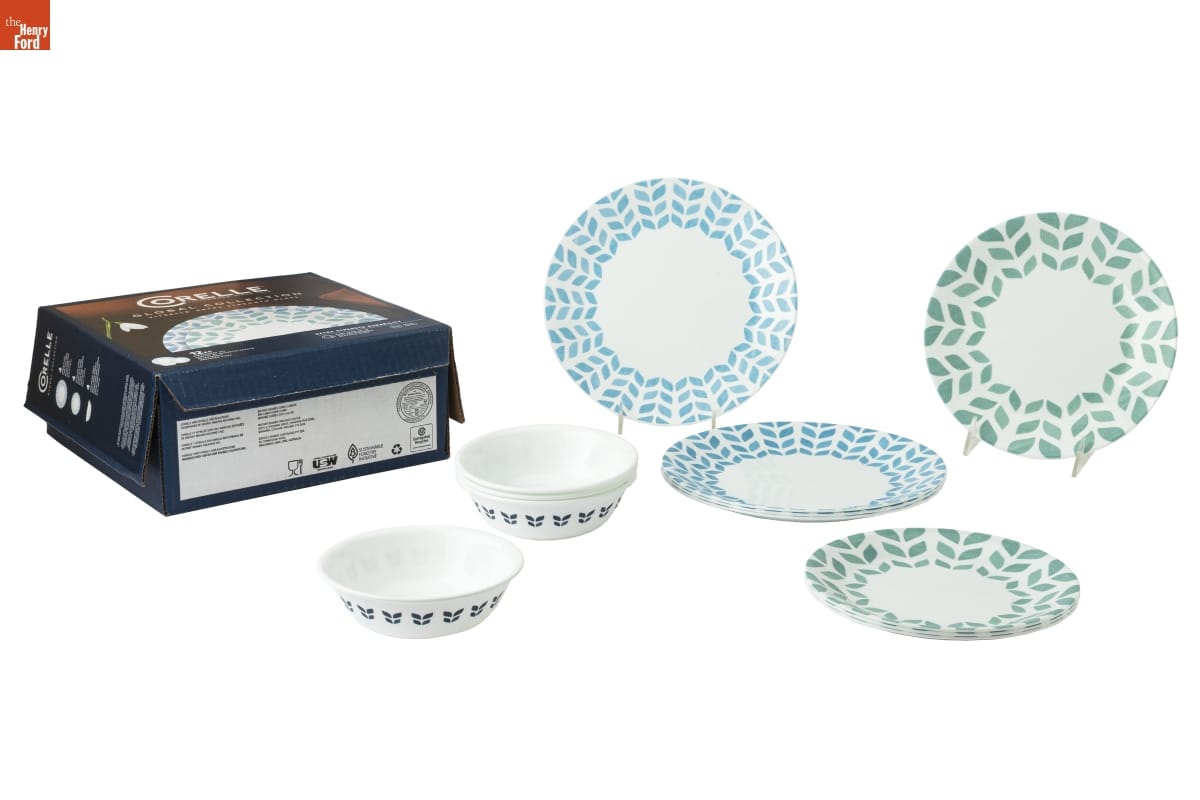 on top of packaging: CORELLE(R) / LIVINGWARE[TM] SINCE 1970 / VITRELLE(R) EXTRA STRENGTH GLASS / DINNERWARE SET / [...] on front of packaging: CORELLE(R) / LIVINGWARE[TM] SINCE 1970 / GLOBAL COLLECTION / VITRELLE(R) EXTRA STRENGTH GLASS / 12 PC / DINNERWARE SET / [...] / NORTHERN PINES / EXTRA STRENGTH DURABILITY / MADE FROM UP TO / 80% PRE CONSUMER / RECYCLED GLASS / SPACE / SAVING on back of packaging: CORELLE(R) / LIVINGWARE[TM] SINCE 1970 / VITRELLE(R) EXTRA STRENGTH GLASS / Developed by our researchers in Corning, New York in 1970, Vitrelle is a remarkable three-layer thermally / laminated glass that provides exceptional durability while never compromising on style. / [...] on side of packaging: CORELLE(R) / LIVINGWARE[TM] SINCE 1970 / GLOBAL COLLECTION / 4 / DINNER PLATES / [...] / 4 / SALAD/SIDE PLATES / [...] / 4 / SOUP/CEREAL BOWLS / [...] on side of packaging: CO SINCE 1970 / Bringing home styles / inspired by the world. / [...] / PLATES AND BOWLS MADE OF VITRELLE(R) / GLASS IN U.S.A. / [...] on bottom of packaging: CORELLE AND VITRELLE ARE REGISTERED / TRADEMARKS OF INSTANT BRANDS HOLDINGS INC. / [...]