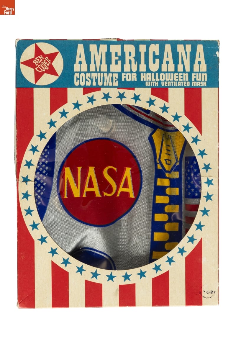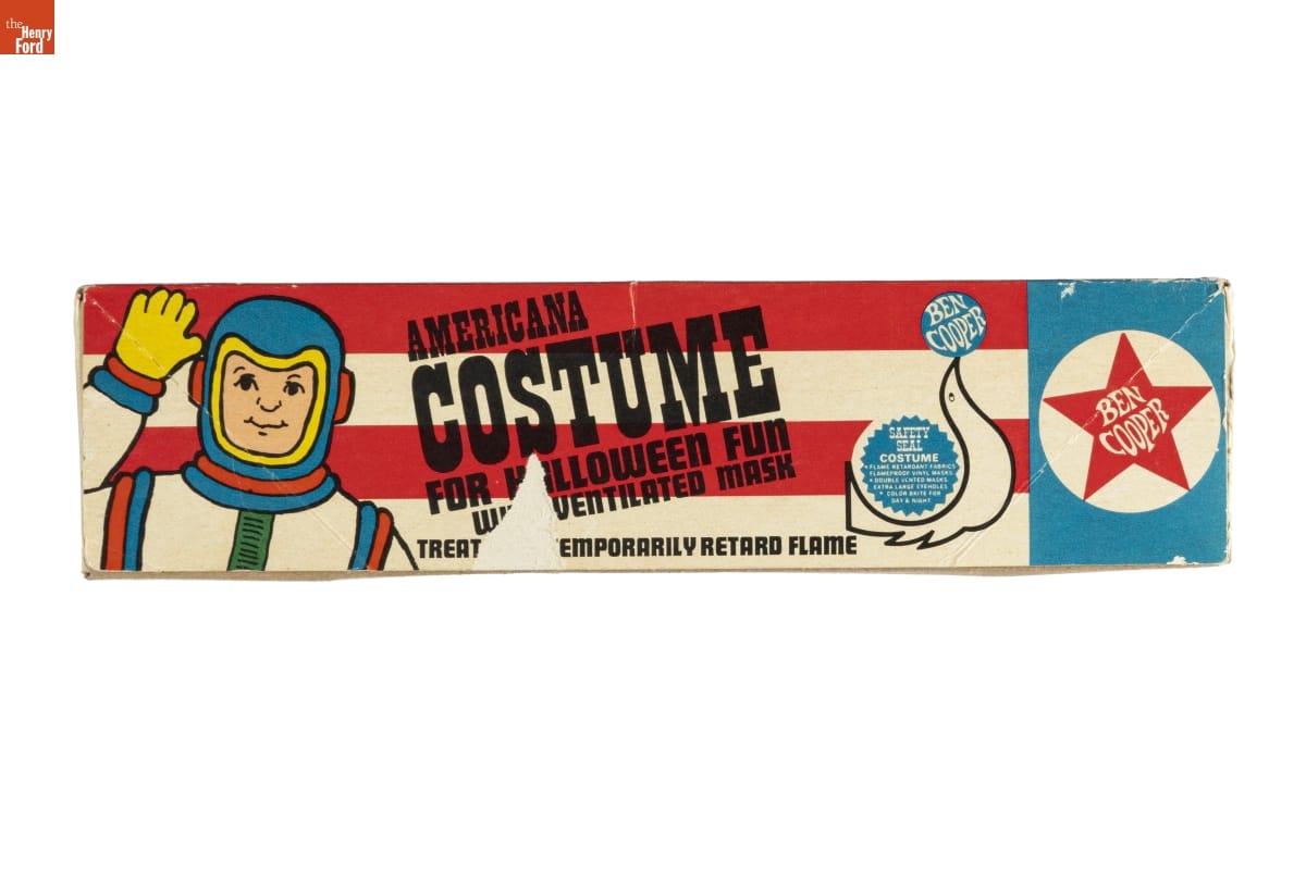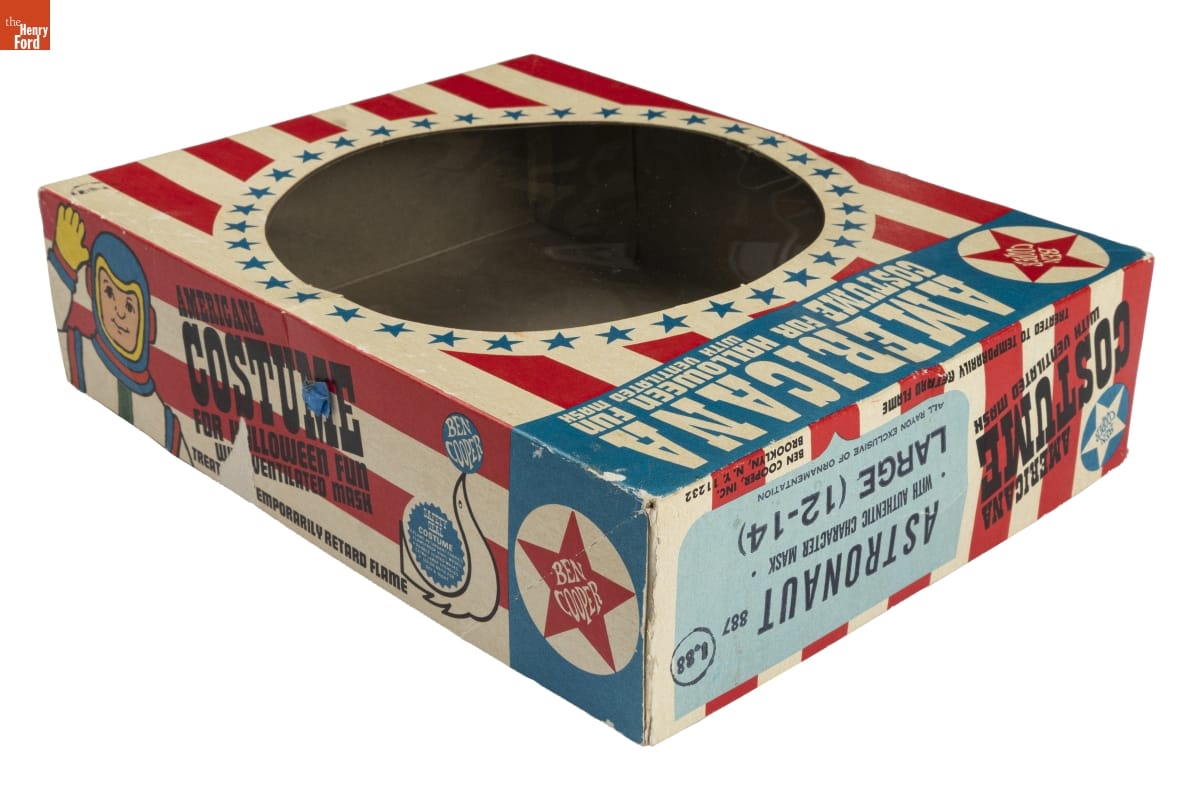 on mask: NASA /ASTRONAUT on front of jumpsuit: NASA on tag at collar of jumpsuit: BEN COOPER / TREATED TO / TEMPORARILY / RETARD FLAME / NOT WASHABLE / WASHING / REMOVES FLAME / RETARDANT / MADE IN U.S.A. / Large (12-14) on front of packaging: BEN / COOPER / AMERICANA / COSTUME FOR HALLOWEEN FUN / WITH VENTILATED MASK on ends of packaging: AMERICANA / COSTUME / WITH VENTILATED MASK / ASTRONAUT 887 / WITH AUTHENTIC CHARACTER MASK / LARGE (12-14) / ALL RAYON EXCLUSIVE OF ORNAMENTATION / 1.88 / TREATED TO TEMPORARILY RETARD FIRE / BEN COOPER, INC./ BROOKLYN, N.Y. 11232 on sticker on end of packaging: SSK / KEY 1 / $1.44 on sides of packaging: AMERICANA COSTUME / FOR HALLOWEEN FUN / WITH VENTILATED MASK / TREATED TO TEMPORARILY RETARD FLAME / BEN / COOPER / BEN / COOPER / SAFETY SEAL COSTUME / FLAME RETARDANT FABRICS / FLAMEPROOF VINYL MASKS / DOUBLE VENTED MASKS / EXTRA LARGE EYE HOLES / COLOR BRITE FOR / DAY & NIGHT on back of packaging: BEN / COOPER / SAFETY SEAL COSTUME / FLAME RETARDANT FABRICS / FLAMEPROOF VINYL MASKS / DOUBLE VENTED MASKS / EXTRA LARGE EYE HOLES / COLOR BRITE FOR / DAY & NIGHT