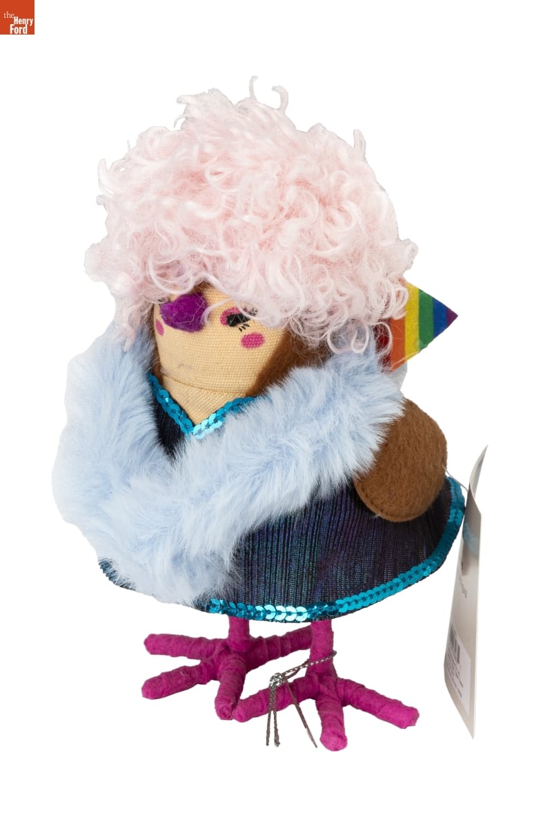 on front of attached product tag: PRIDE on back of attached product tag: pride bird / drag queen bid figural 335-03-9323 / 0 42738 03583 1 / Sun Flower Merchandise Co., Ltd. / 7F., No. 1, GuangFu S. Road., Taipei, Taiwan / Origin: China / For decorative use only, not a toy. 10/2022 on front of metal tag on chain around foot: 2023 on back of metal tag on chain around foot: LABIRD