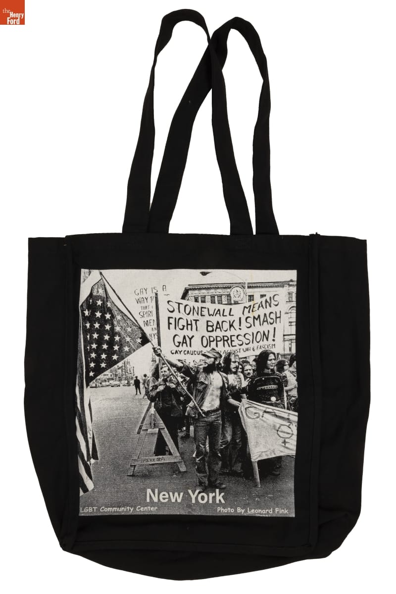 on front: STONEWALL MEANS / FIGHT BACK! SMASH / GAY OPPRESSION! / [...] / New York / LGBT Community Center Photo by Leonard Fink on back" The / Stonewall / Inn(R)/ New York on tag inside bag: Q-TEES / PROMOTIONAL / PRODUCT. NOT MEANT / TO BE WASHED. WASHING / MAY RESULT IN DISCOLORATION OF / THE PRODUCT. DO NOT WASH THIS PRODUCT / RN # 104772 / 100% COTTON / MADE IN PAKISTAN
