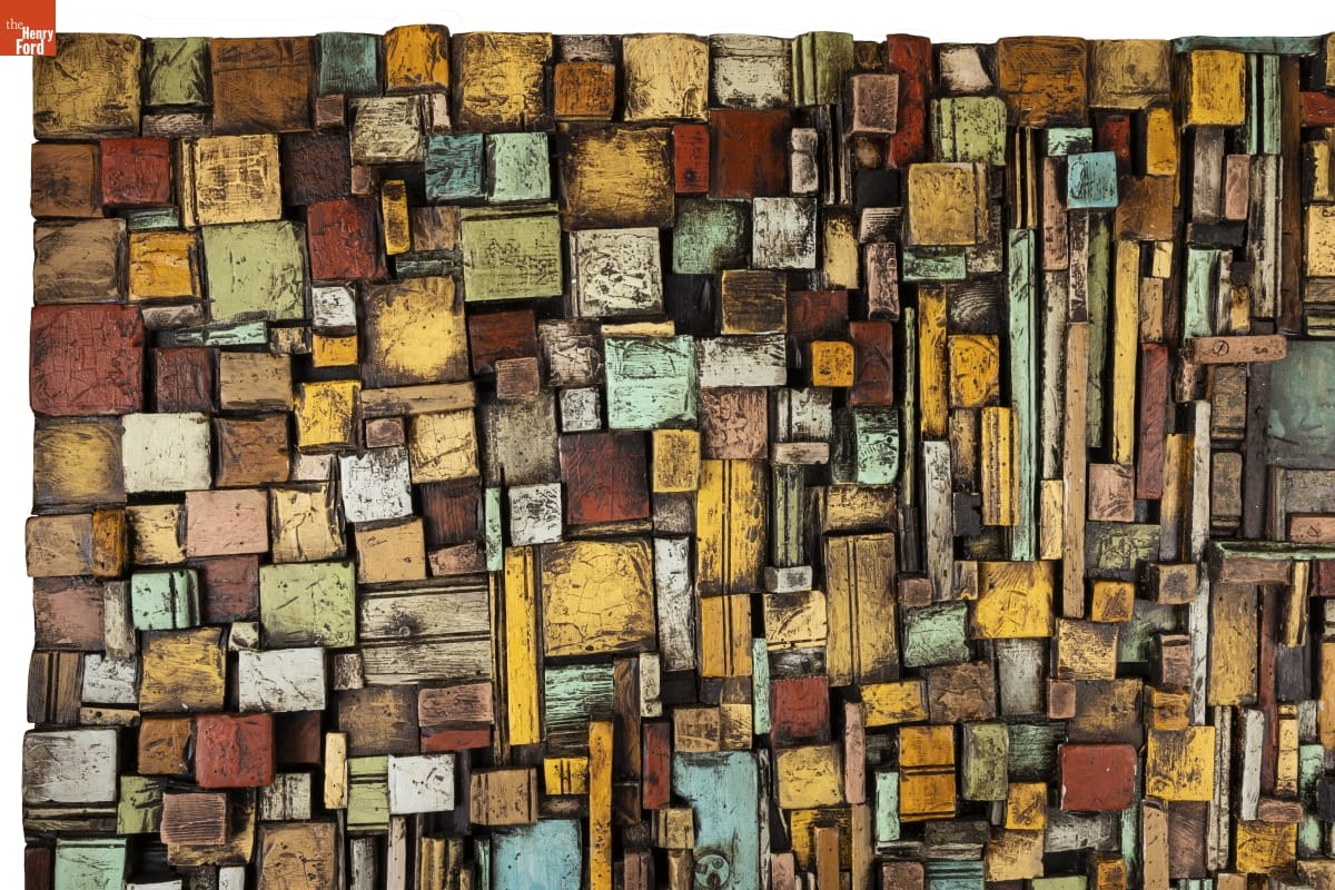 New Orleans artist Jean-Marcel St. Jacques creates "wooden quilts" like this one using wood and other debris from his Hurricane Katrina-damaged home. The style of his work honors both his quilter great-grandmother – to whom this piece is particularly dedicated – and his great-grandfather, who was a junk collector and hoodoo practitioner.