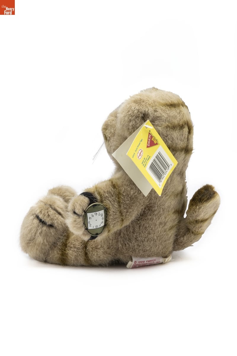 on front of tag attached to ear: MISTER / ROGERS' / NEIGHBORHOOD(R) / (C) 1988 Family Communications, Inc. on inside of tag attached to ear: DANIEL STRIPED TIGER is a shy / young tiger who became tame when / he learned not to bite anything but / his food. He enjoys all the things / that most children like, so long as / they aren't too scary. He often / needs encouragement to try / something new. / All new materials. Hand-Crafted. TO CLEAN: / Surface washable with warm water and mild / soap. Air dry. When dry, brush to restore / appearance of plush. CAUTION: Remove all / plastic taggers before giving toy to child. on back of tag attached to ear: #03416 Daniel Striped Tiger / LIMITED WARRANTY TO CONSUMERS / Good Housekeeping / PROMISES / REPLACEMENT OR REFUND IF DEFECTIVE / DAKIN (R) / DAKIN, INC. / San Francisco, CA / Product of Thailand on tag attached to bottom: (c) 1988 FAMILY / COMMUNICATIONS, INC. / DAKIN, INC. / SAN FRANCISCO, CA / PA REG. NO. 118 / ALL NEW MATERIALS / CONTENTS: POLYESTER / FIBER / PRODUCT OF THAILAND