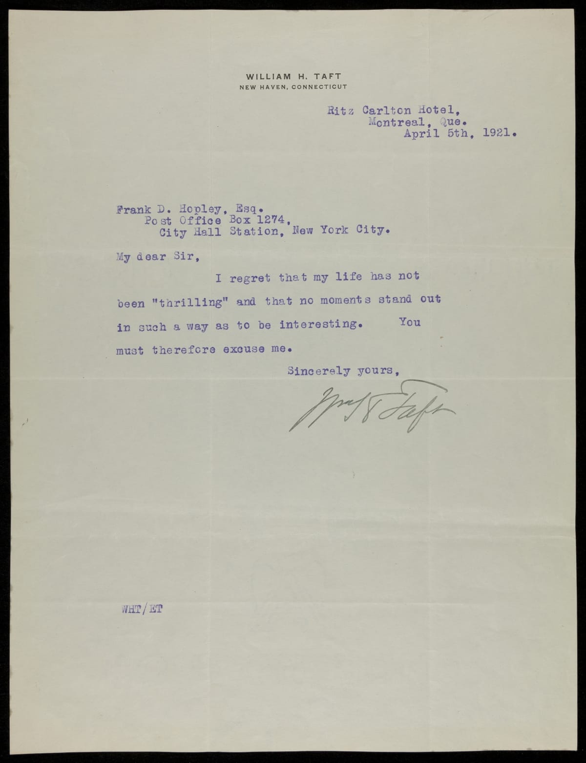 Frank Dorrance Hopley (1872-1933) wrote a number of boy's books and authored stories and articles for national magazines and newspapers. In 1921, Hopley had an idea for an article--he would ask famous individuals to share their life's most thrilling moment. Former President William Taft responded that he would be unable to help as his life had not been "thrilling."