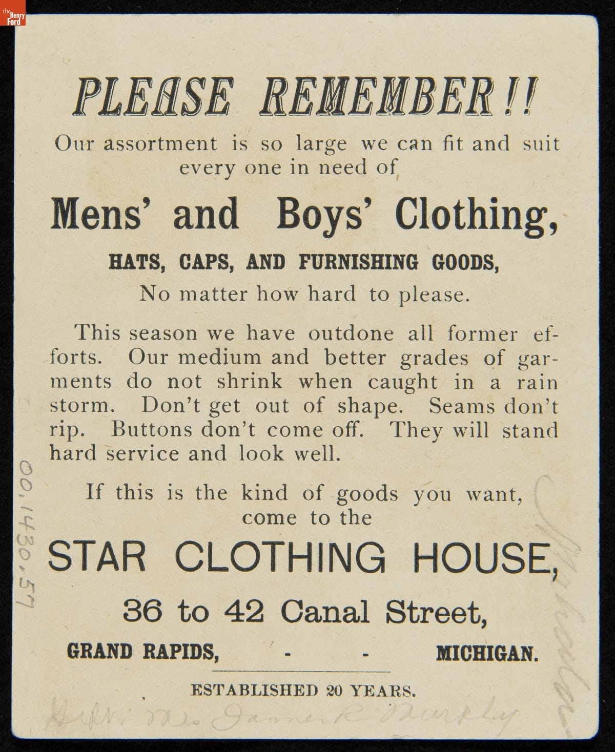As color printing gained momentum in the late 19th century, trade cards became a major means of advertising goods and services. Americans enjoyed and often saved the little advertisements found in product packages or distributed by local merchants. This trade card advertises the Star Clothing Cooperative in Grand Rapids, Michigan.