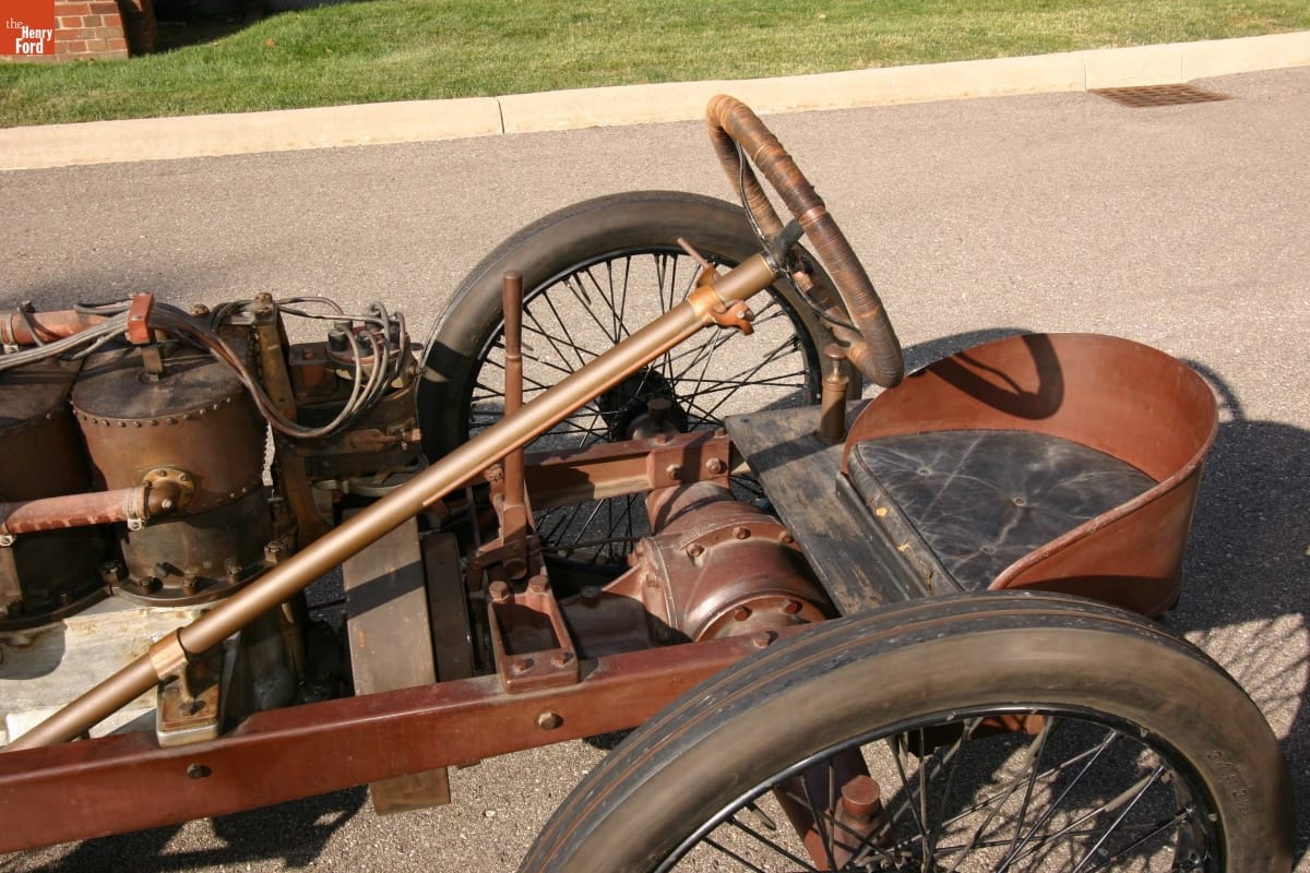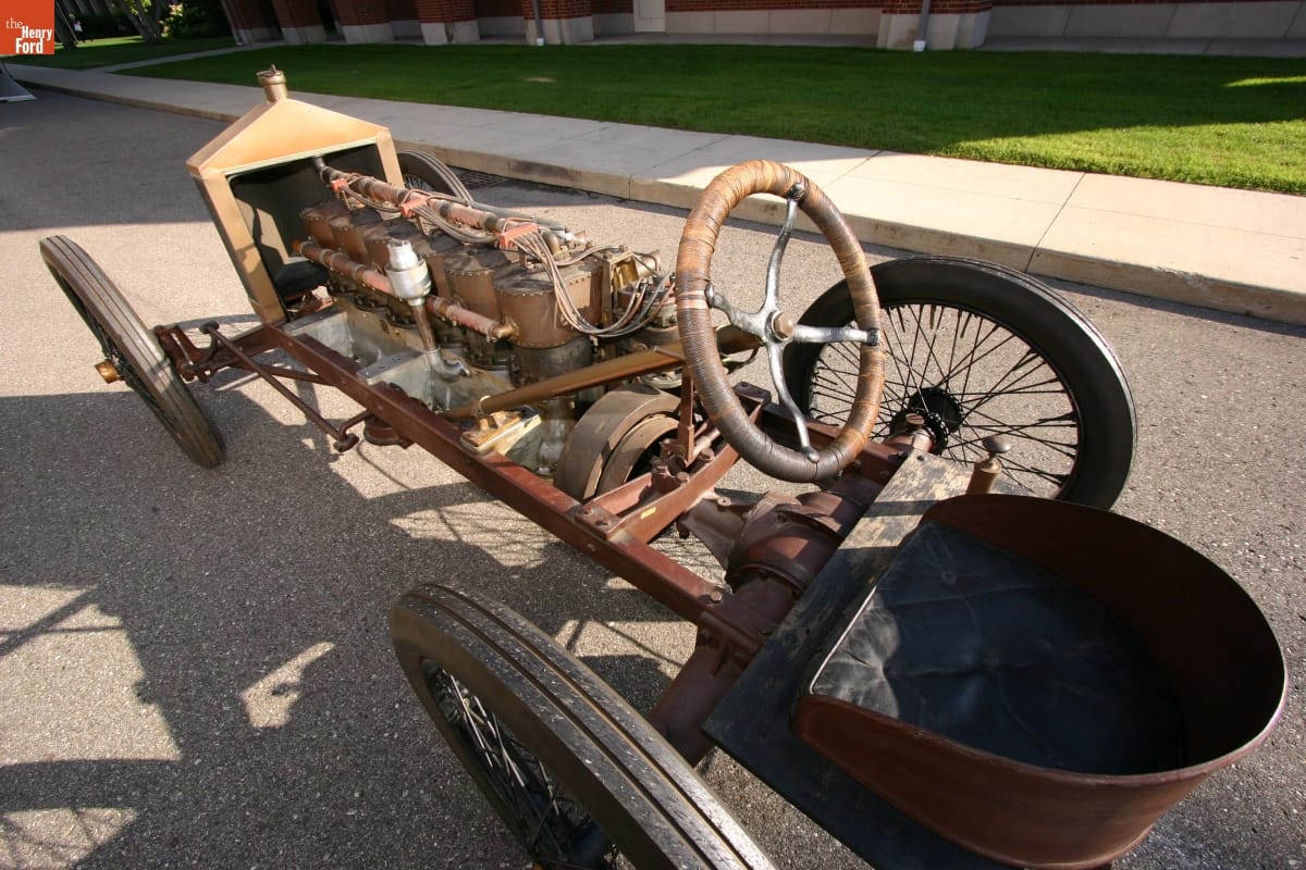 This is one of Henry Ford's least successful race cars. Built in 1907, it used a six-cylinder engine from the Ford Model K passenger car, and Henry called it "666." Ford built the car to break the existing record of 51-3/5 seconds for one lap of a one-mile track. However, a right rear tire failed at the Michigan State Fairgrounds and "666" took driver Frank Kulick through the wall surrounding the track. Kulick walked with a limp for the rest of his life, and "666" never raced again.