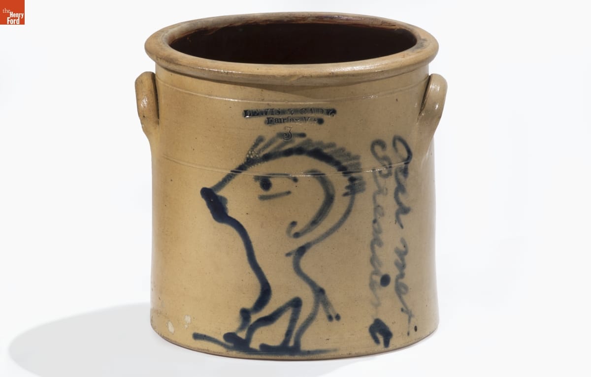 This crock was made of a durable, leak-proof pottery called stoneware. The orange-peel-like outer glaze was created when the potter threw handfuls of common rock salt into a white-hot kiln during the piece's firing. Salt-glazed stoneware pieces were decorated with an array of designs, including this caricatured image of Democratic candidate Stephen Douglas from the 1860 Presidential campaign.