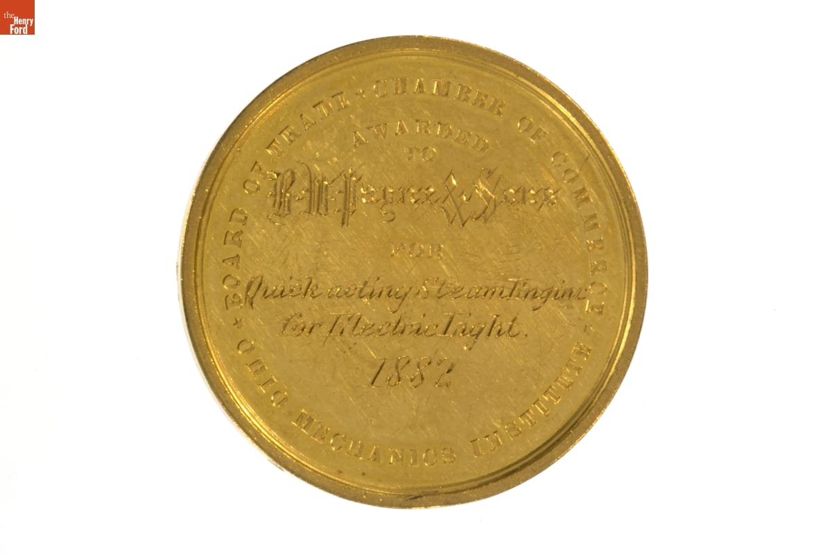 Between 1870 and 1888 Cincinnati businessmen backed a series of fairs to promote their city. Exhibitors to these Cincinnati Industrial Expositions displayed inventions, artwork, and manufactured goods. Officials awarded medals and other premiums to participants whose products illustrated important cultural or technological contributions. B. W. Payne and Sons received this medal for its "Quick acting steam engine for electric light."