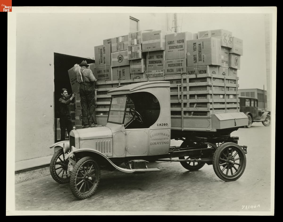 Loading Boxes of Westinghouse Mazda Lamps onto a Ford Truck, 1925
