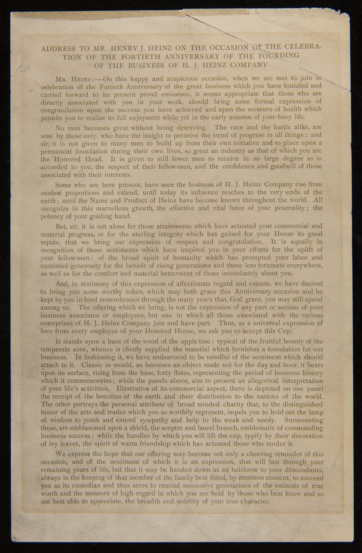 H.J. Heinz was beloved by his business colleagues and employees. This address was made to Heinz during a celebration of the 40th anniversary of the founding of the H.J. Heinz Company. The address praises Heinz for his character, determination, and success, and mentions the presentation of a commemorative cup with the hope that it would become a family heirloom and reminder of the occasion.