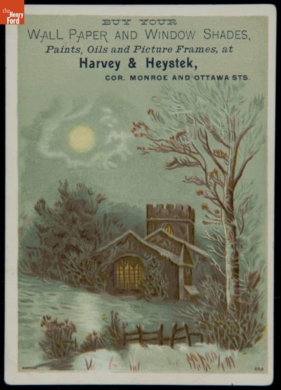 Advertised products sold by Harvey & Heystek, Grand Rapids, Michigan. Card lithographed by J.H. Bufford & Co. in New York, New York
