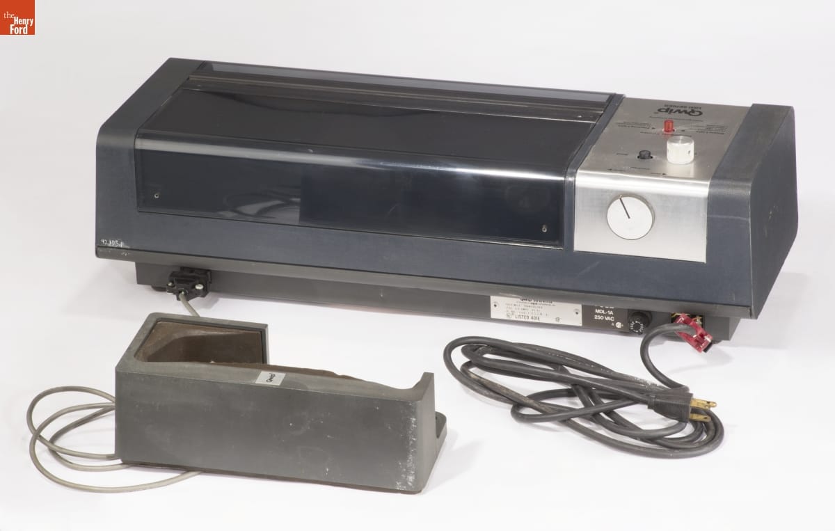 The Qwip is an early telephone-transmission fax machine. To transmit a document, two people established a telephone voice connection--a document attached to the drum of one fax machine, blank paper to the other. The transmitting Qwip read the document line by line, converting image into sound. The receiving fax then reassembled the sound back into a printed image.