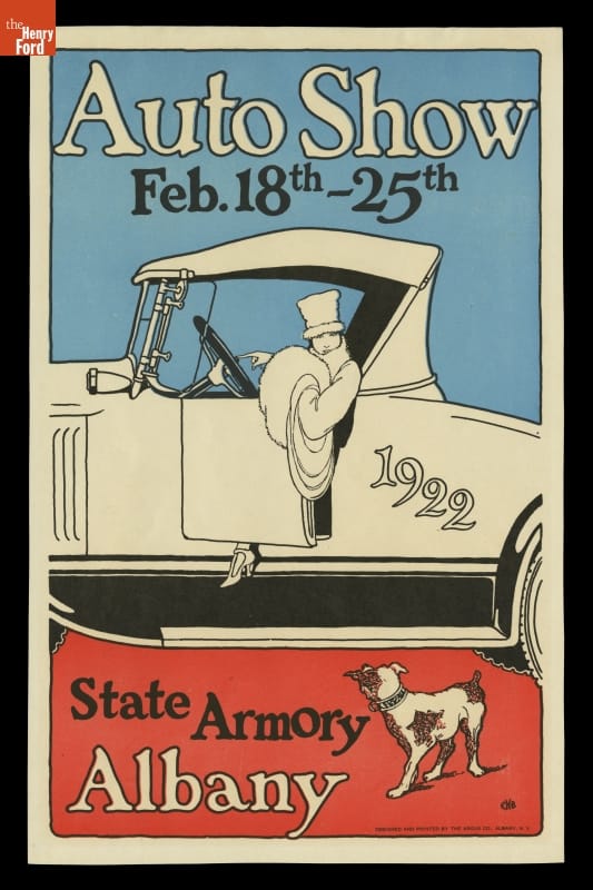 Auto shows use glamour, giveaways, spectacle, and sex appeal to show off manufacturers' latest offerings. Part entertainment and part consumer education, auto shows have their roots in 19th Century industrial exhibitions and world's fairs. New York City hosted America's first auto show in 1900 and the idea caught on. This poster promoted the 1922 Albany, New York, Auto Show.