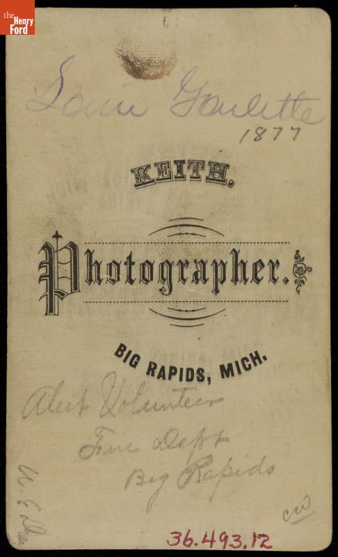 Handwritten in pencil on back of image: Louie Goulette / 1877 / Big Rapids / Alert Volunteers / Fire Dept / Big Rapids / W.E. Drew Photographer's imprint on back of image: KEITH / PHOTOGRAPHER / BIG RAPIDS, MICH.
