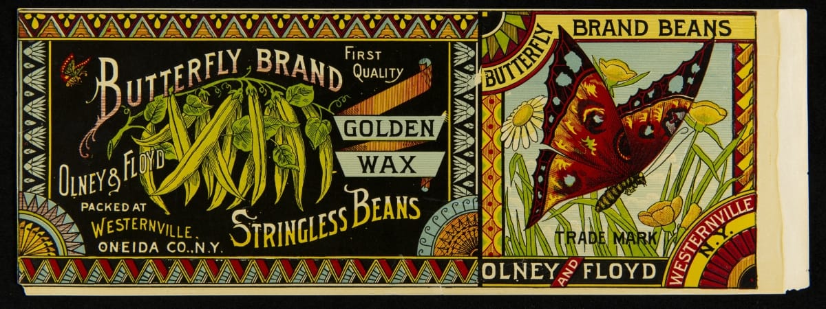 Throughout the late-19th to early-20th centuries, lithographers created labels to help sell products. Manufacturers of foodstuffs utilized the same design for several different products -- a strategy which helped customers distinguish one brand over another. Olney and Floyd's Butterfly Brand products were easy to identify with their colorful, eye-catching labels and signature butterfly.